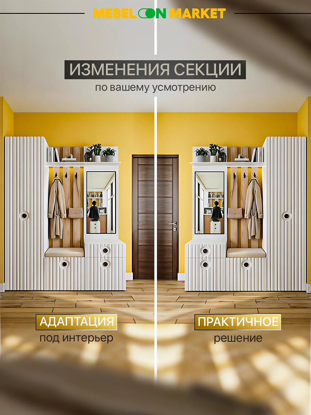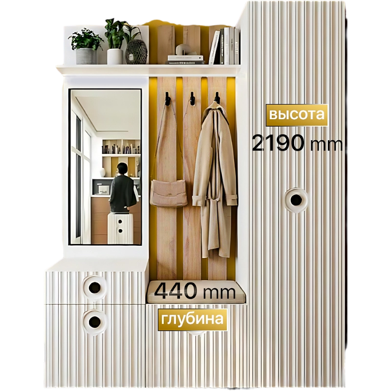Konstruktsiya funksionallik uchun mo‘ljallangan: keng shkaf, qulay oynali bo‘lim, ko‘p maqsadli yashiklar va kiyim ilgaklari kundalik foydalanishda maksimal qulaylik yaratadi.