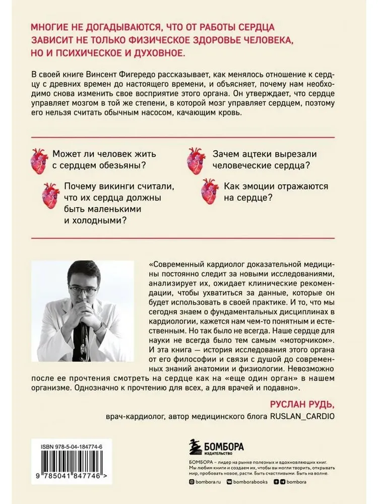 ПРАВДА ЛИ, ЧТО СЕРДЦЕ — ВСЕГО ЛИШЬ МЕХАНИЧЕСКИЙ НАСОС? Тысячи лет человек верил, что весь его разум и чувства заключены в сердце. Аристотель связывал сердце с душой и считал источником тепла, в то время как мозг воспринимался всего лишь «рефрижератором», предназначенным для охлаждения горячего сердца. Почему же все изменилось? В этой книге врач-кардиолог и исследователь Винсент М. Фигередо рассказывает, что значило сердце в разных культурах, как менялись представления о нем с зарождения цивилизации до наших дней и как научная мысль повлияла на достижения современной кардиологии. · Что думали наши предки о сердце? · Чем оно является в культуре, искусстве и науке? · Как представления о сердце изменили мир? · Существует ли связь между сердцем и мозгом? · Сможем ли мы жить без сердца? Эта книга покажет всю историю человечества и объяснит, в чем наши древние предки заблуждались, рассуждая о сердце, а в чем — опередили даже нас. «Винсент Фигередо помогает нам понять сердце как культурный символ, биологическое чудо и центральную тему в истории человечества. Эта книга, являющаяся образцом науки и повествования, обязательна к прочтению». — ДАНИЭЛЬ ВАЙС, президент и главный исполнительный директор одного из крупнейших художественных музеев «Метрополитен-музея»