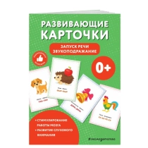 Развивающие карточки предназначены запуска речи малышей, начиная с 6-месячного возраста. В комплекте 34 плотные двусторонние карточки с имитацией звуков животных, транспорта, музыкальных инструментов, людей и природных явлений.