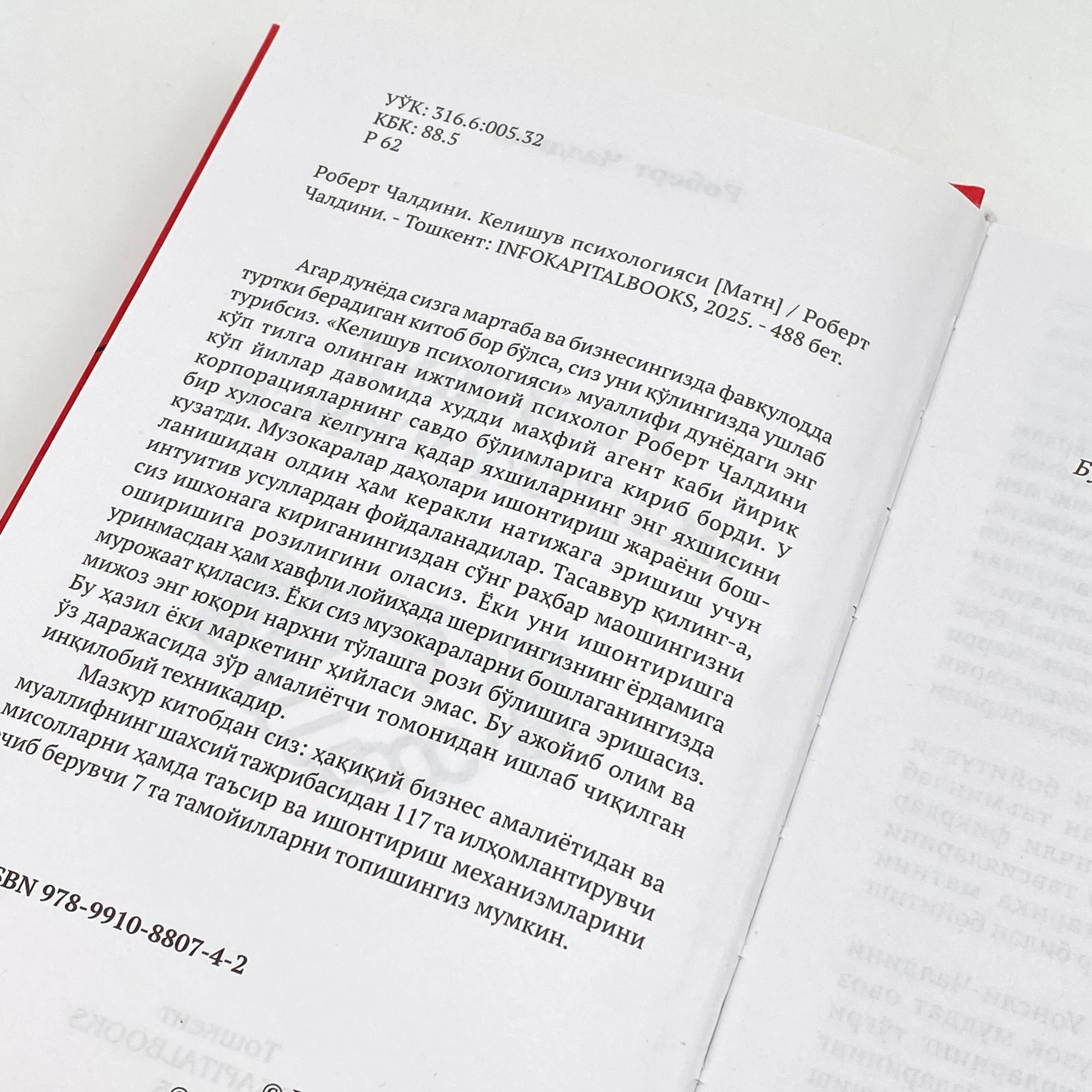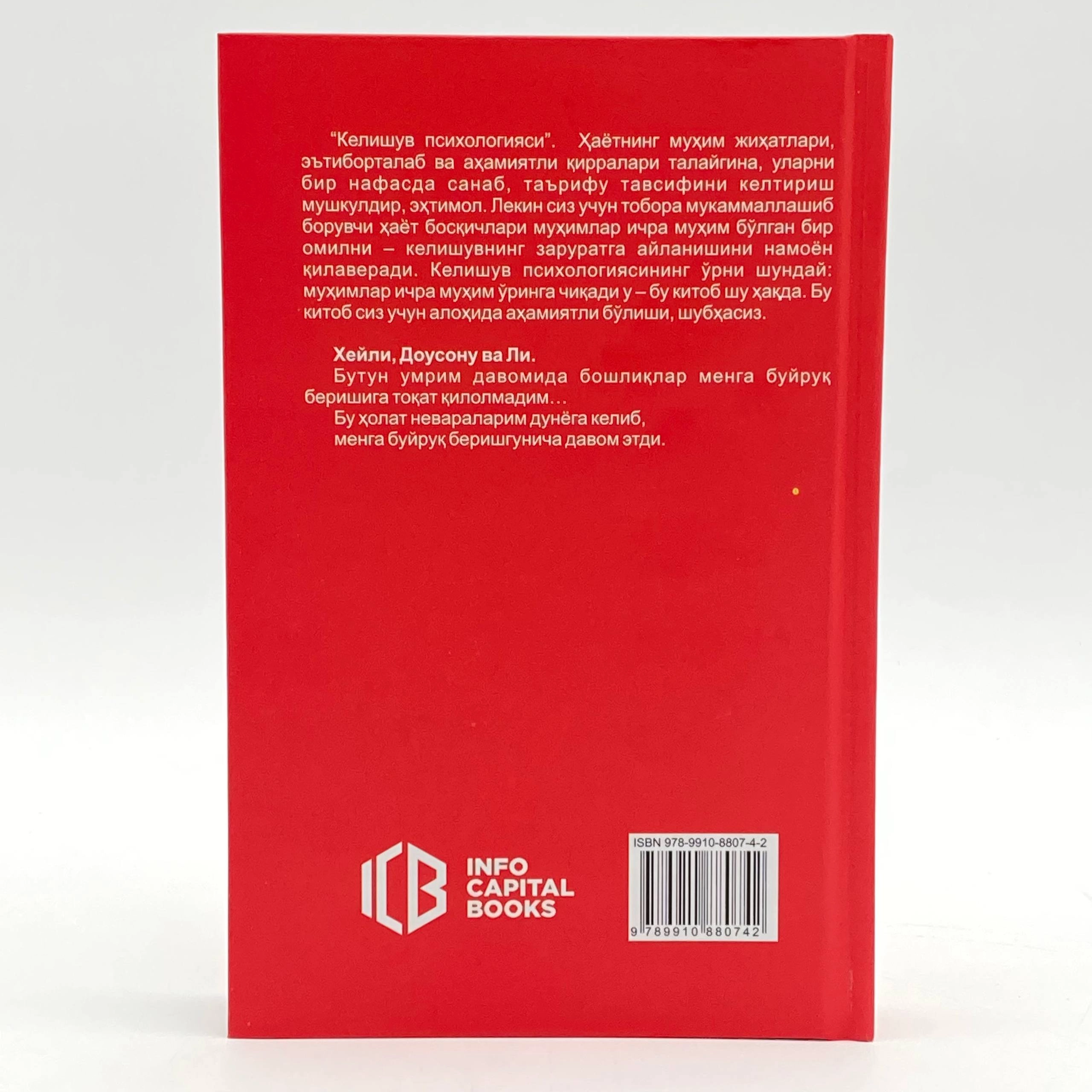 Agar dunyoda sizga martaba va biznesingizda favqulodda turtki beradigan kitob bor bo'lsa, siz uni qo'lingizda ushlab turibsiz. «Kelishuv psixologiyasi» muallifi dunyodagi eng ko'p tilga olingan ijtimoiy psixolog Robert Chaldini ko'p yillar davomida huddi maxfiy agent kabi yirik korporatsiyalarning savdo bo'limlariga kirib bordi. U bir xulosaga kelgunga qadar yaxshilarning eng yaxshisini kuzatdi. Muzokaralar daholari ishontirish jarayoni boshlanishidan oldin ham kerakli natijaga erishish uchun intuitiv usullardan foydalanadilar. Tasavvur qiling-a, siz ishxonaga kiriganingizdan so'ng rahbar maoshingizni oshirishiga roziligini olasiz. Yoki uni ishontirishga urinmasdan ham xavfli loyihada sherigingizning yordamiga murojaat qilasiz. Yoki siz muzokaralarni boshlaganingizda mijoz eng yuqori narxni to'lashga rozi bo'lishiga erishasiz. Bu xazil yoki marketing xiylasi emas. Bu ajoyib olim va o'z darajasida zo'r amaliyotchi tomonidan ishlab chiqilgan inqilobiy texnikadir.