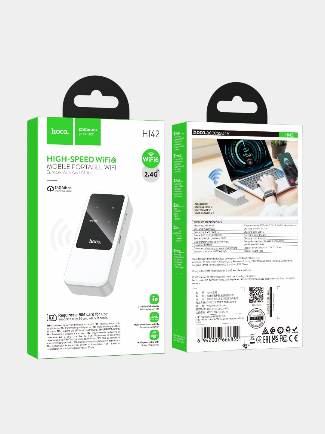 Hoco HI42 — беспроводной Wi-Fi роутер на базе чипа Aic8800DW с поддержкой Wi-Fi 6 на частоте 2,4 ГГц. Скорость передачи данных: загрузка — 50 Мбит/с, скачивание — 150 Мбит/с. Поддерживает одновременное подключение и использование несколькими устройствами. Источник питания — аккумулятор 2000 мА·ч × 2; время автономной работы — 8 часов. Корпус выполнен из материала ABS. Поддерживает регионы Европы, Азии и Африки; не поддерживает Северную и Южную Америку.