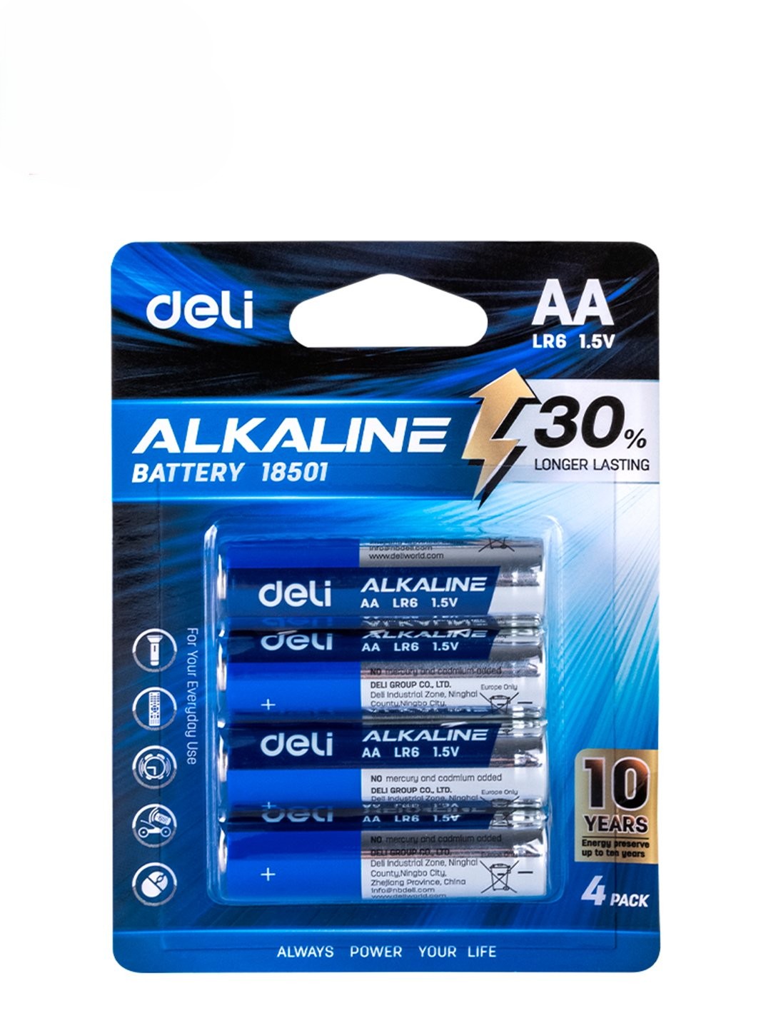 Щелочная батарея Deli E18501 (AA/LR6, 4 шт.) — надежный источник питания для бытовой электроники, игрушек, пультов управления и других устройств. Батареи обеспечивают стабильную работу и долгий срок службы, сочетая высокую емкость с экономичностью.