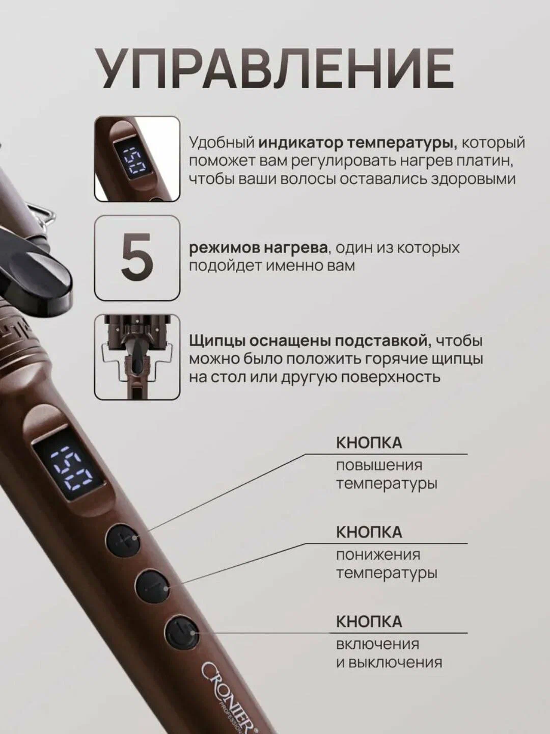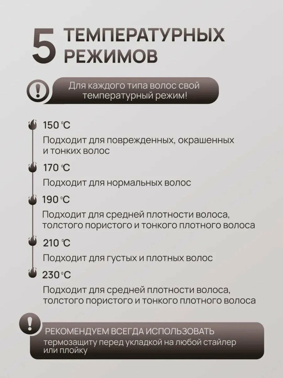 5 температурных режимов: Индивидуальный подбор температуры для любого типа волос (от 150∘C до 230∘C).