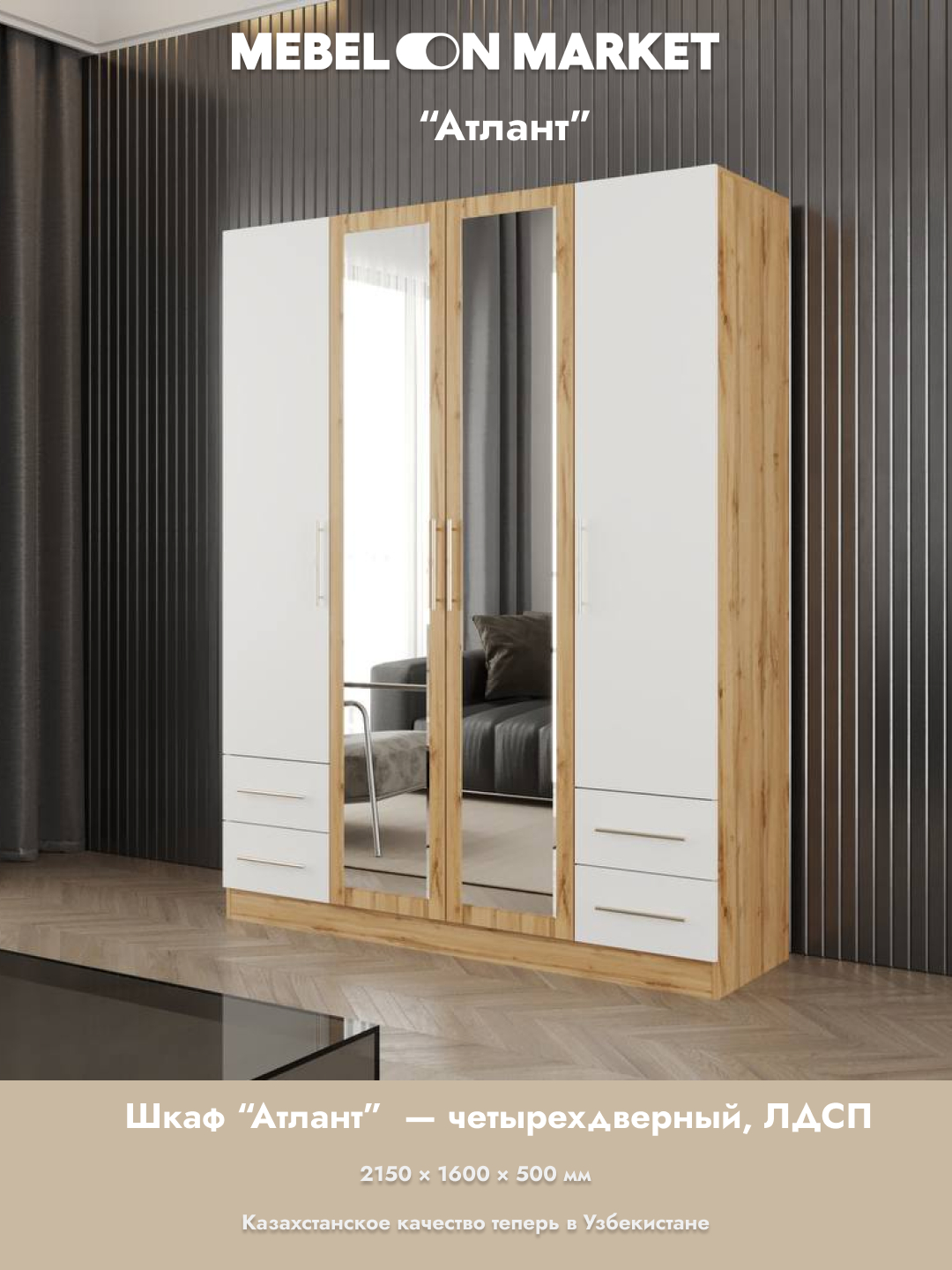 Шкаф «Атлан 4Д» — это просторное и функциональное решение для хранения одежды всей семьи. Продуманная внутренняя организация позволяет удобно разместить как повседневную одежду, так и верхние вещи. Современный дизайн и универсальные расцветки делают шкаф отличным выбором для спальни или прихожей, легко вписываясь в любой интерьер.