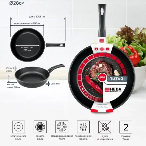 Корпус ковороды из литого алюминия не подвержен деформации (в отличие от штампованного) и гарантирует равномерный нагрев.