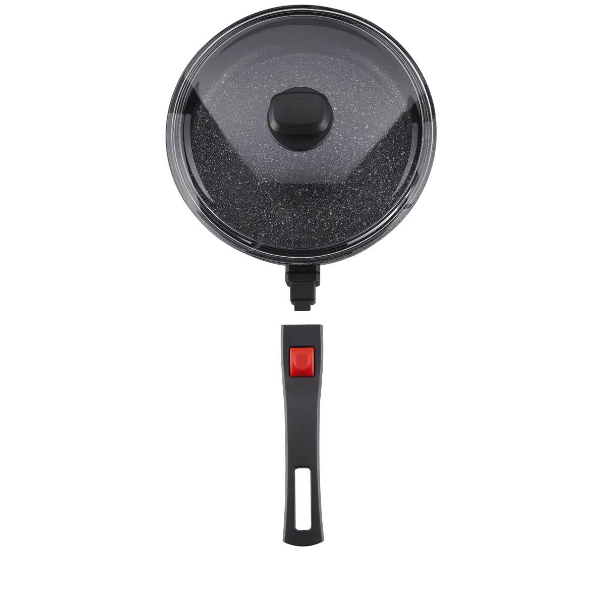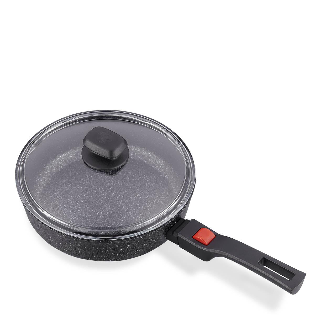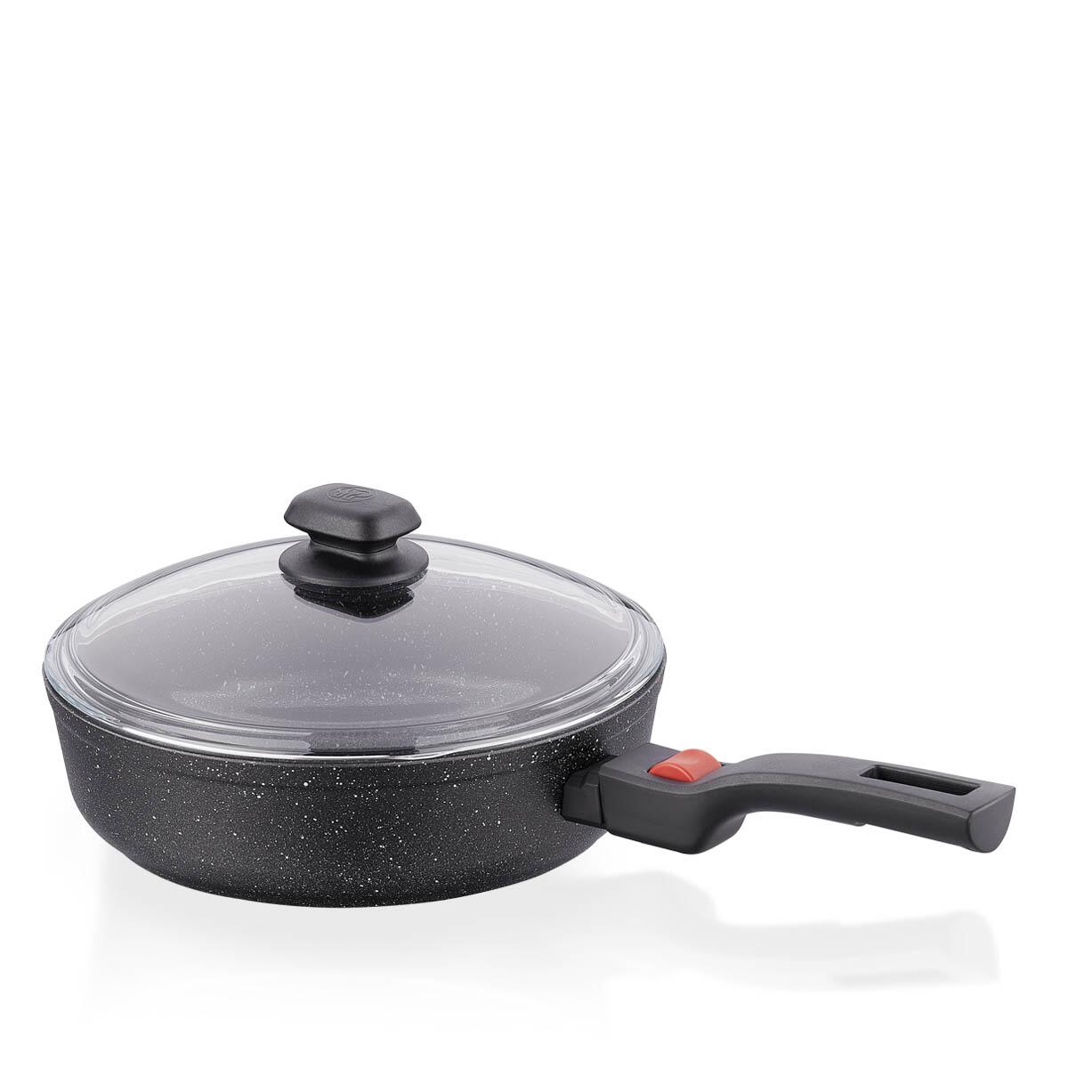 Прозрачная крышка из термостойкого стекла позволяет контролировать процесс приготовления, не поднимая крышку и не выпуская тепло. Эргономичная бакелитовая ручка не нагревается и обеспечивает безопасное использование даже при длительном нагреве. Благодаря оптимальной глубине 7 см сковорода идеально подходит для жарки котлет, приготовления плова, овощных рагу, паст и других блюд.