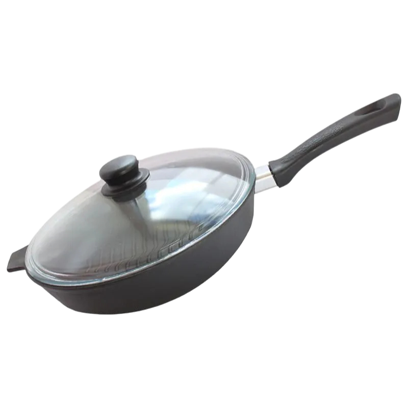 Сковорода Камская Посуда G8062 — гриль чугунная 280×60 мм с бакелитовой ручкой и стеклянной крышкой