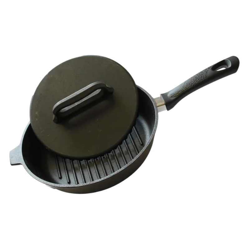 Чугунная сковорода-гриль появилась на наших кухнях сравнительно недавно. Первое время эти сковородки использовались только в мире профессиональной кулинарии, сейчас чугунная сковорода-гриль стала очень популярна среди любителей домашней кухни. В комплекте чугунная пресс крышка
