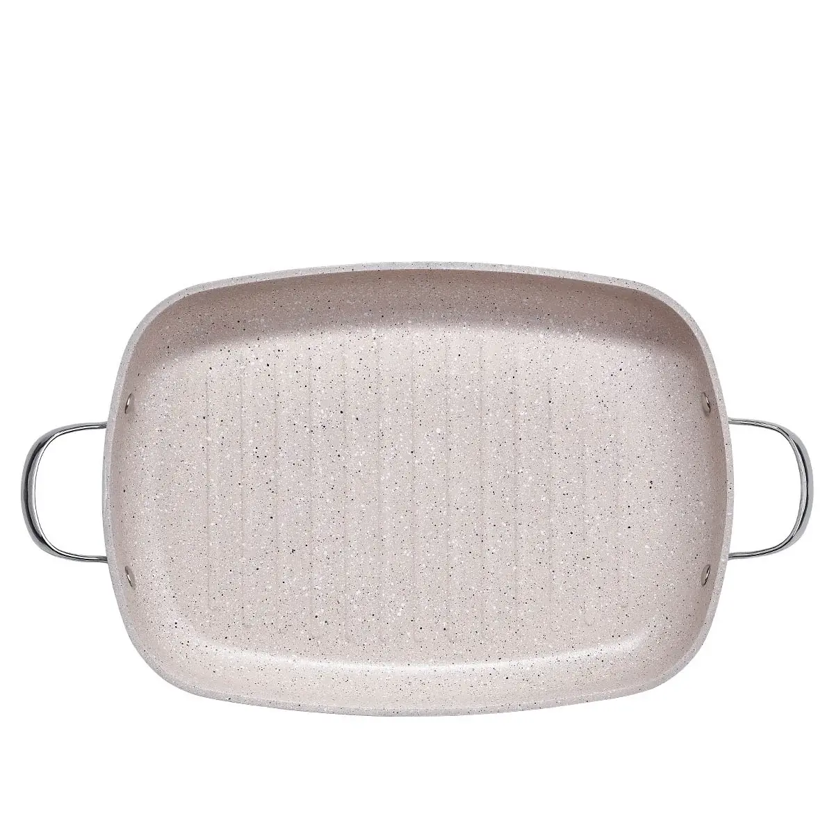 Прямоугольная форма сковороды делает её идеальной для гриля и запекания продуктов. Эффект «гранитного камня» придаёт сковороде стильный внешний вид, гармонично вписывающийся в любую кухню. Эргономичная ручка обеспечивает удобство и безопасность при ежедневном использовании.