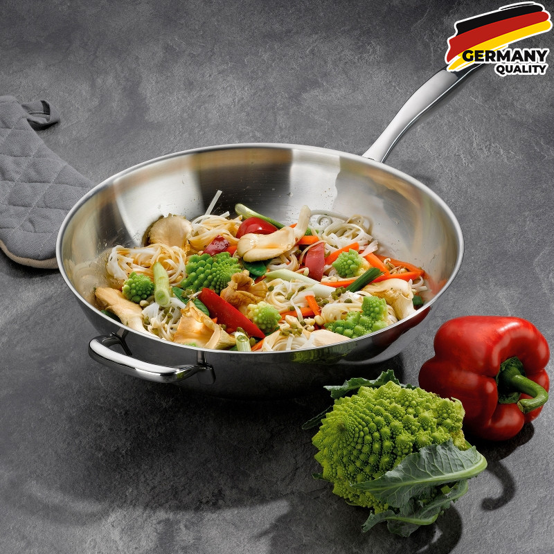 Корпус изготовлен из нержавеющей стали 18/10, устойчивой к коррозии, высоким температурам и механическим повреждениям. Многослойное капсульное дно с алюминиевым сердечником равномерно распределяет тепло и удерживает его, сокращая время приготовления. Вок совместим со всеми типами плит — газовыми, электрическими, стеклокерамическими и индукционными.