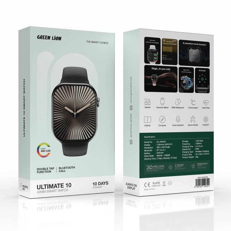 Представляем смарт-часы Green Lion Ultimate 10 42 мм — воплощение передовых технологий в элегантном дизайне. Эти умные часы оснащены потрясающим 1,85-дюймовым AMOLED-дисплеем, поднимающим планку качества визуального отображения и удобства использования. Благодаря аккумулятору емкостью 200 мАч и беспроводной зарядке для удобства эти умные часы будут держать вас на связи в течение всего дня. Ultimate 10, оснащенный 684 КБ ОЗУ и 256 МБ ПЗУ, сочетает в себе все — от основных функций мониторинга здоровья, таких как термометр и трекер сердечного ритма, до более интерактивных функций, таких как голосовой помощник и встроенный ChatGPT, являясь идеальным другом, который может вас поддержать. на ходу. Green Lion Ultimate 10 сочетает в себе мирные занятия в одних часах: сочетание игр и функции Dynamic Island расширяют возможности повседневного взаимодействия и приносят удовольствие и функциональность. Дополнительной функцией этих универсальных часов является наличие устройства для чтения электронных книг и компаса, которые можно использовать для быстрой навигации и развлечений. Эти умные часы также станут хорошим другом при активном образе жизни, а несколько спортивных режимов помогут вам достичь ваших целей в фитнесе.