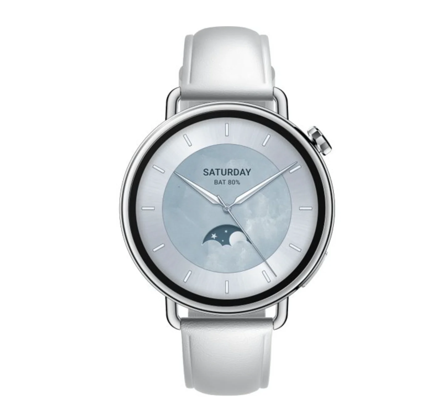 Часы оснащены круглым AMOLED-дисплеем 44 мм с высокой чёткостью и насыщенными цветами. Экран отлично читается при любом освещении, а плавная анимация делает взаимодействие максимально комфортным. Кожаный ремешок белого цвета придаёт устройству элегантный внешний вид и удобен при длительном ношении.