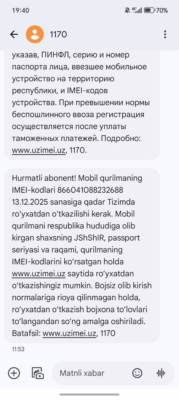 IMEI рўйхатдан ўтмаган экан иккаласи хам. Сотувчи утказиб беришингизни сўрайман