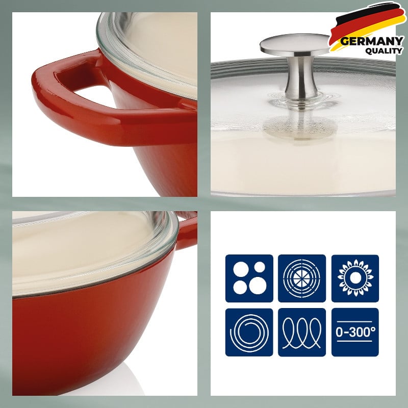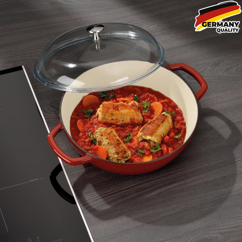 KELA Calido создан для тех, кто ценит качество и комфорт. Эмалированное покрытие защищает чугун от коррозии и облегчает уход, а сама кастрюля подходит для жарки, тушения, запекания и даже подачи готовых блюд. Благодаря высокой теплоёмкости чугун медленно нагревается, но долго сохраняет температуру, позволяя блюдам приготовиться равномерно и не подгорать.