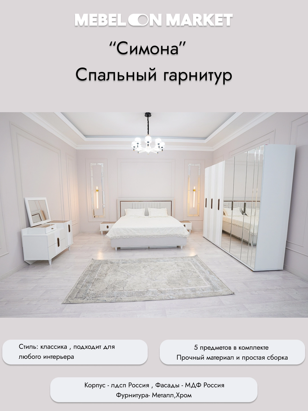 Tavsif: “Simona” garnituri — bu zamonaviy va qulay yotoqxona mebeli, stil va amaliyotni uyg‘unlashtiradi. Oq rang va porloq qoplama xonani yorqin va keng qiladi, har qanday interyerga moslashadi.
