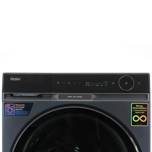 Управление реализовано с помощью сенсорной панели с поворотным регулятором и информативного дисплея. Поддерживается удалённое управление по Wi-Fi через приложение Evo от Haier, что позволяет запускать и контролировать стирку со смартфона. Предусмотрены отложенный старт, автовзвешивание белья, функция памяти, индикация времени до окончания цикла, звуковой сигнал и блокировка от детей.