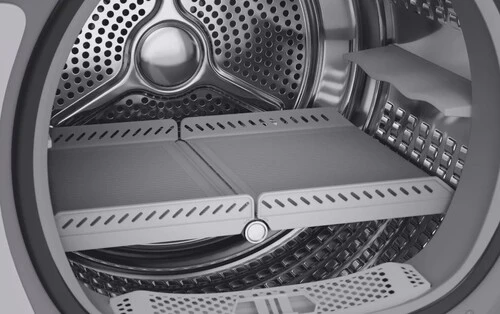 Несмотря на стандартные размеры корпуса, модель обладает рекордной вместимостью — до 10 кг, что позволяет сушить большие партии белья и объёмные вещи без перегрузки. Огромный 112-литровый барабан с реверсивным вращением обеспечивает равномерную сушку, предотвращает спутывание и уменьшает образование складок.