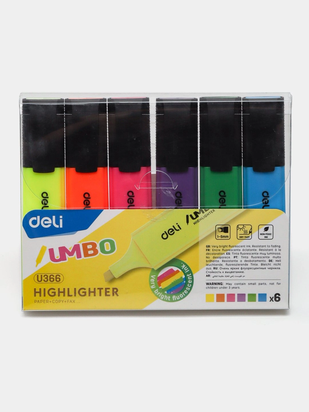 6 ta yorqin rangdagi tekstoydelyatel to‘plami, qirralangan uch bilan. Siyoh suv asosida bo‘lib, tez quriydi, ranglari o‘chmaydi va hidsiz. Har xil turdagi qog‘ozda matnni belgilash uchun mos.