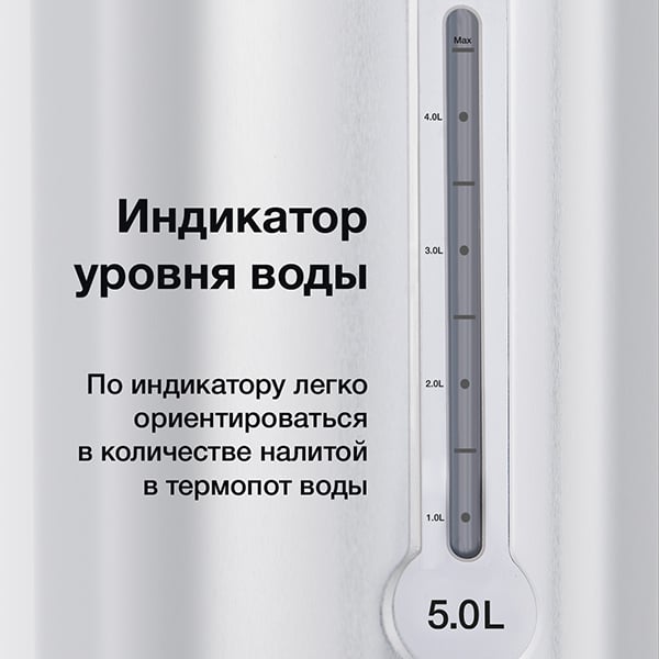 Объём термопота составляет 5 литров, а мощность — 750 Вт, что обеспечивает быстрое нагревание воды и её длительное поддержание в горячем состоянии. Тип нагрева накопительный с закрытым нагревательным элементом, а колба и корпус выполнены из нержавеющей стали, что гарантирует долговечность и безопасность.