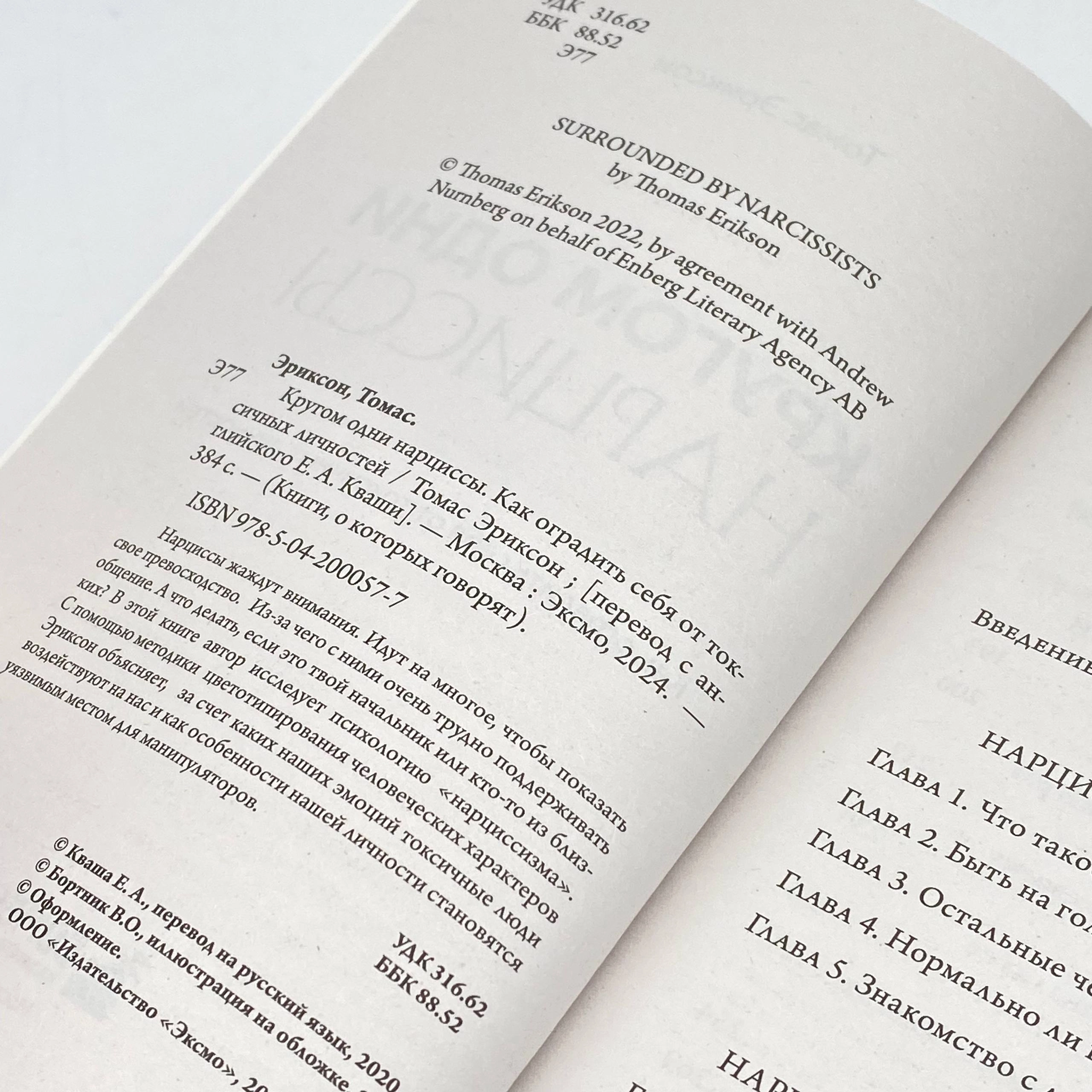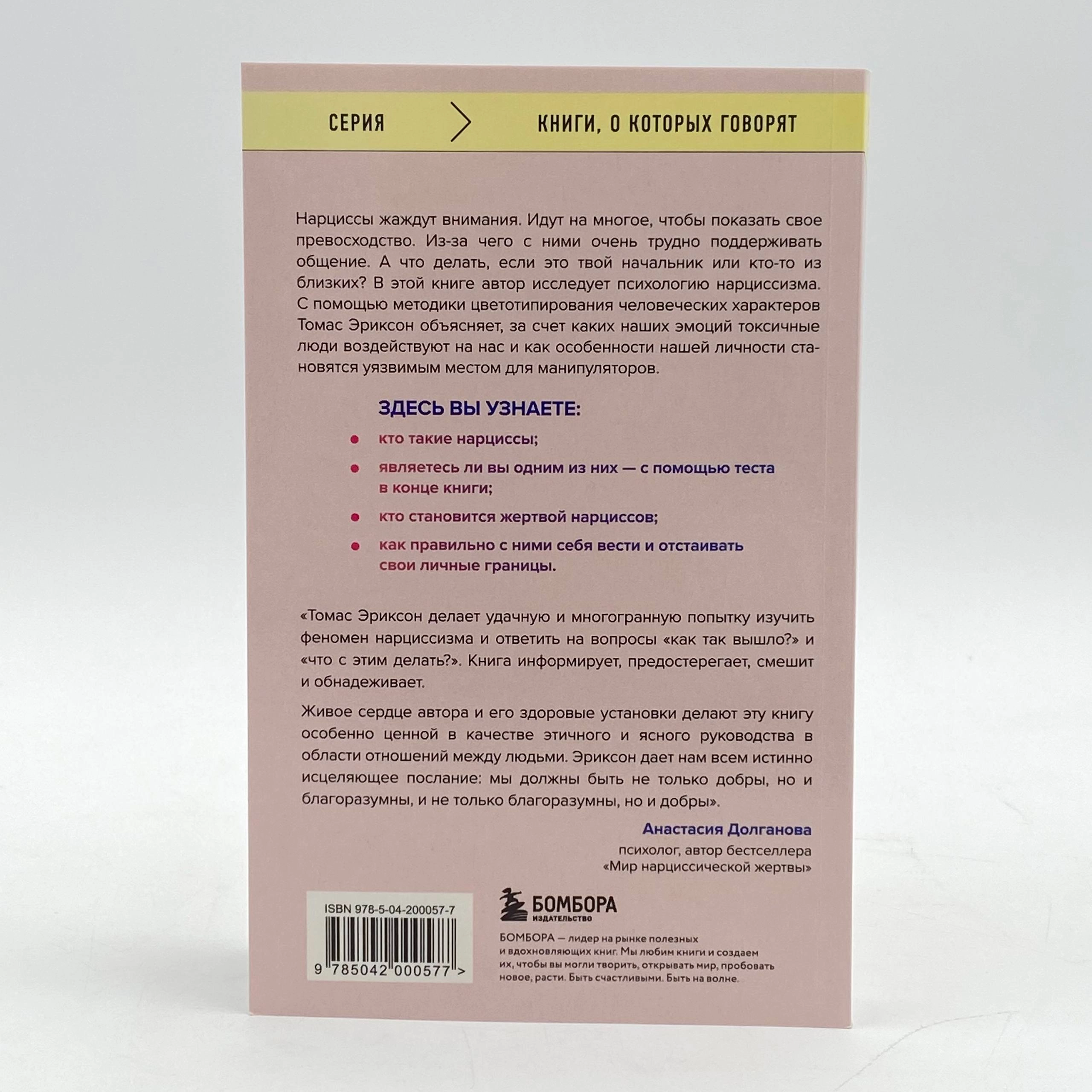 Эта книга - универсальная отмычка к личности любого человека и лежит на столе каждого шведского руководителя, учителя и журналиста. Ее автор, знаменитый психолог Томас Эриксон, делит всех людей на четыре цветовых типа. Он описывает логику поведения, темперамент, систему ценностей "красных", "желтых", "зеленых" и "синих". Объясняет, как находить с ними общий язык, вести проекты, разрешать конфликты и заводить партнерские отношения. "Кругом одни нарциссы. Как оградить себя от токсичных личностей" Нарциссы жаждут внимания. Идут на многое, чтобы показать свое превосходство. Из-за чего с ними очень трудно поддерживать общение. А что делать если это твой начальник или кто-то из близких? В этой книге автор исследует психологию "нарциссизма". С помощью методики цветотипирования человеческих характеров Эриксон объясняет, за счет каких наших эмоций токсичные люди воздействуют на нас и как особенности нашей личности становятся уязвимым местом для манипуляторов.