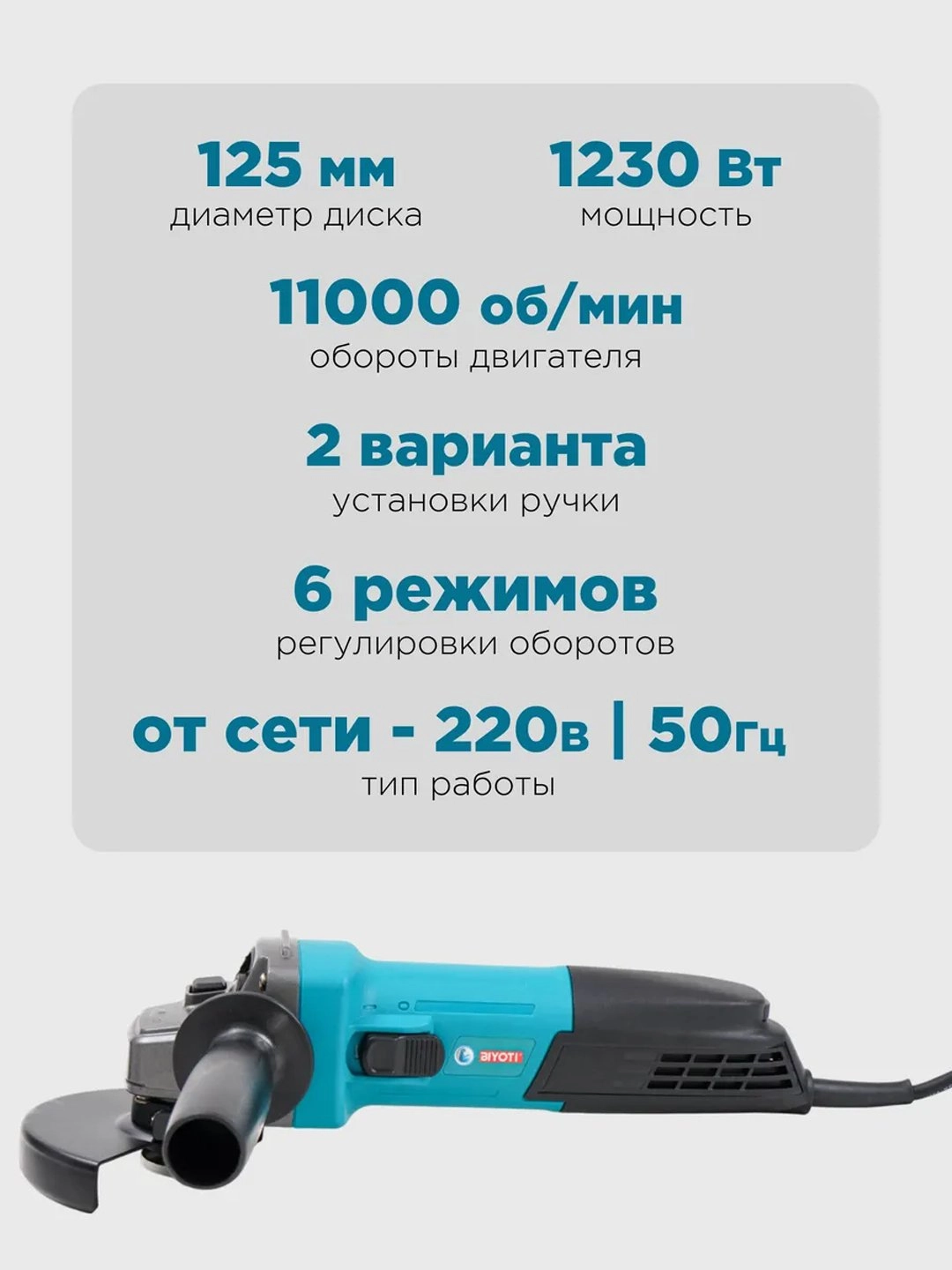 BIYOTI BYT-1253 PRO SPEED – bu 1230 Vt quvvatga ega elektr “bolgarka” bo‘lib, turli materiallarni tez va sifatli ishlov berish uchun yaratilgan. Asbob yuqori unumdorlik, ishonchlilik va qulaylikni birlashtirgan bo‘lib, qurilish, montaj va ta’mirlash ishlarida ajralmas yordamchiga aylanadi.