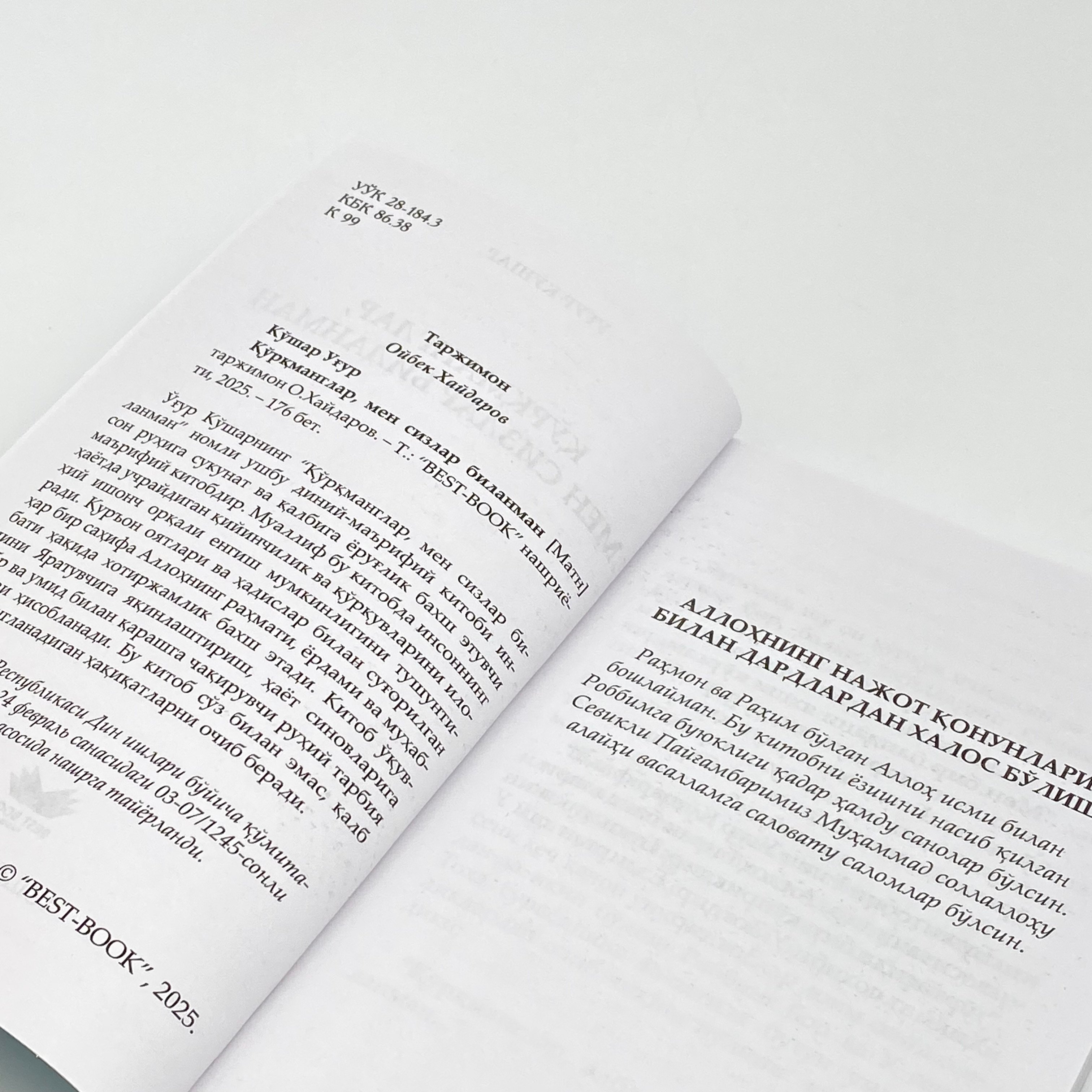1 год гарантии от производителя Примем товары в течении 10 дней и сразу вернём деньгиУғур Қўшарнинг "Қўрқманглар, албатта мен сизлар биланман” номли ушбу диний-марифий китоби инсон рухига сукунат ва қалбига ёруғлик бахш этувчи марифий китобдир. Муаллиф бу китобда инсоннинг ҳаётда учрайдиган қийинчилик ва қўрқувларини илойҳий ишонч орқали енгиш мумкинлигини тушунтиради. Қуръон оятлари ва ҳадислар билан суғорилган ҳар бир саҳифа Аллоҳнинг раҳмати, ёрдами ва муҳаббати ҳақида хотиржамлик бахш этади.