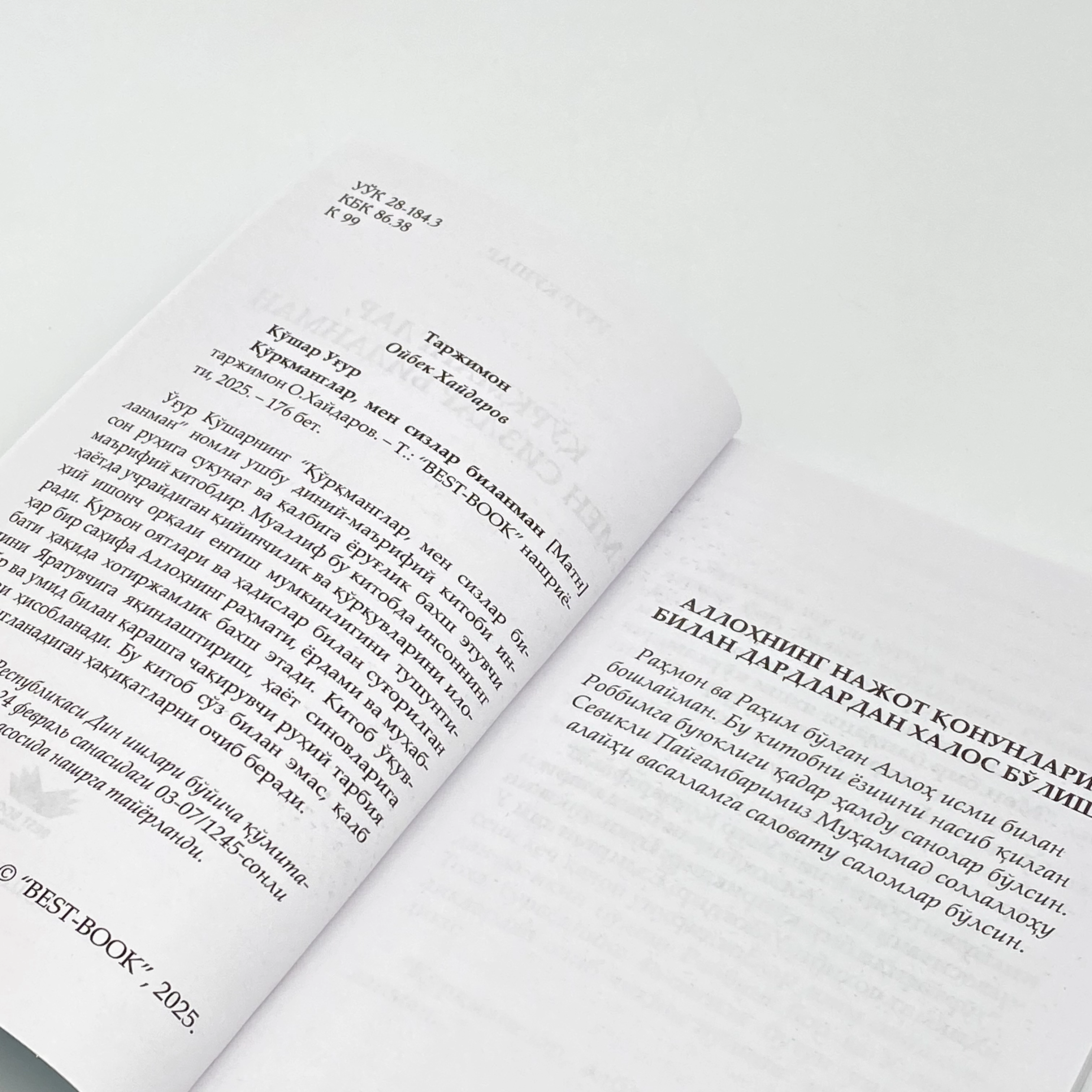 Ug’ur Qo’sharning "Qo'rqmanglar, albatta men sizlar bilanman” nomli ushbu diniy-marifiy kitobi inson ruxiga sukunat va qalbiga yorug’lik baxsh etuvchi marifiy kitobdir. Muallif bu kitobda insonning hayotda uchraydigan qiyinchilik va qo’rquvlarini iloyhiy ishonch orqali yengish mumkinligini tushuntiradi. Qur’on oyatlari va hadislar bilan sug’orilgan har bir sahifa Allohning rahmati, yordami va muhabbati haqida xotirjamlik baxsh etadi.