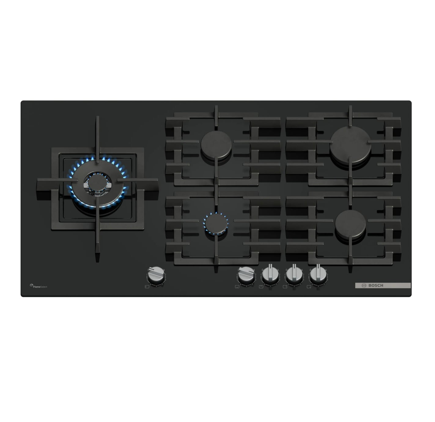 Раздельные чугунные решётки обеспечивают устойчивую опору для посуды, равномерно распределяют нагрузку и подходят для мытья в посудомоечной машине. Управление осуществляется с помощью поворотных переключателей, расположенных на фронтальной панели; ручки съёмные, что упрощает уход за поверхностью. Электроподжиг активируется поворотом переключателя, а система газ-контроля с защитой от затухания пламени автоматически перекрывает подачу газа, повышая уровень безопасности.