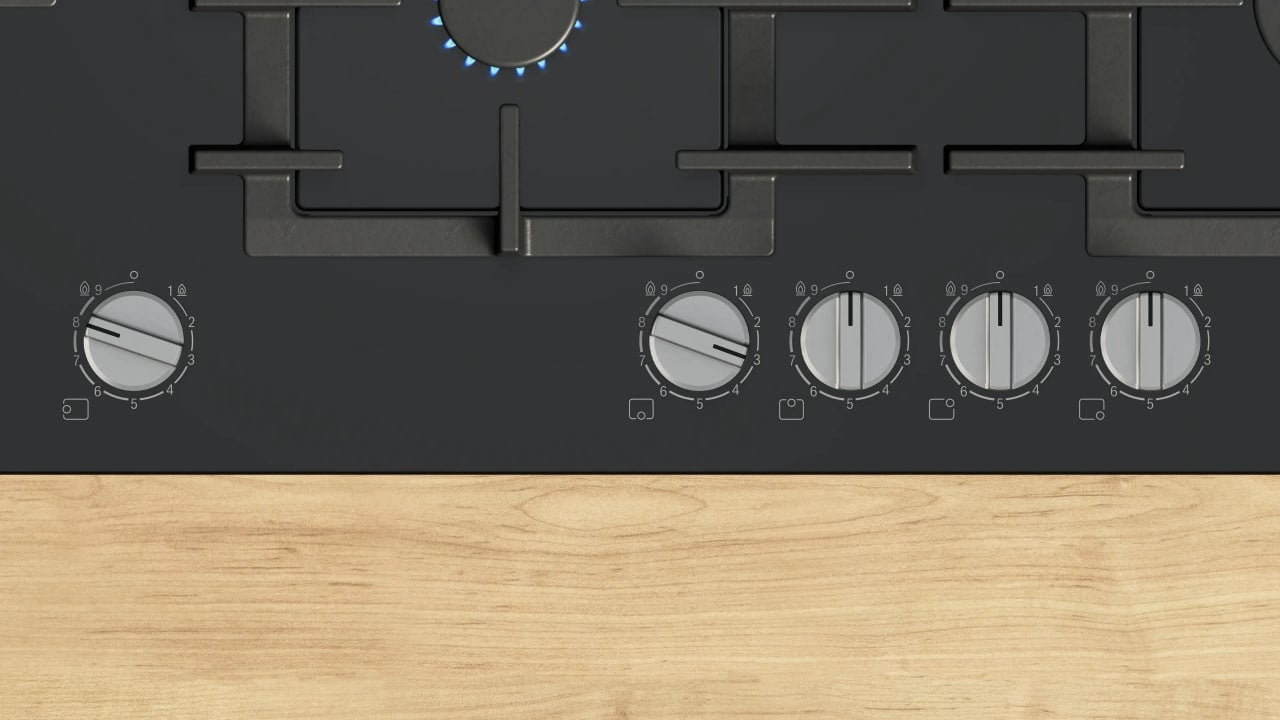 Газовая варочная панель шириной 90 см выполнена из закалённого стекла, которое придаёт кухне современный и аккуратный вид, отличается высокой прочностью и легко очищается от загрязнений. Конструкция предусматривает как накладной монтаж, так и установку вровень со столешницей, что позволяет создать идеально ровную рабочую поверхность. Для flush-монтажа требуется минимальная толщина столешницы 30 мм, для стандартной установки — от 20 мм.