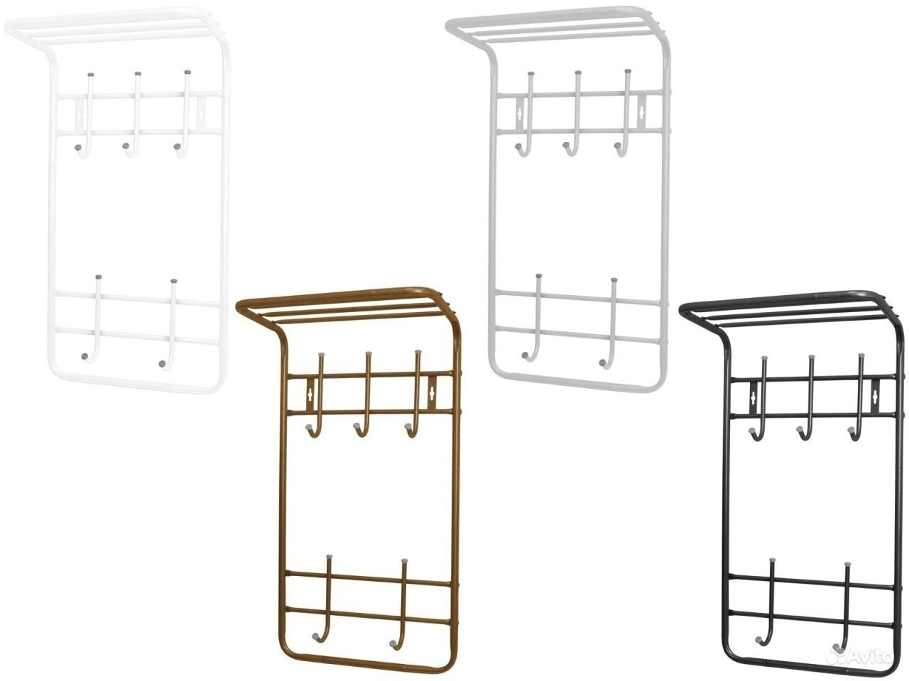 2 qavatli, rafli devorga o‘rnatiladigan ilgich (veshalka) 410×745×255 mm, yupqa devorli quvurdan yasalgan, plastik uchlari bilan, ranglari: qora, kumush, mis antik, oq (5 ta ilgichli). Qadoqda 5 dona mavjud.