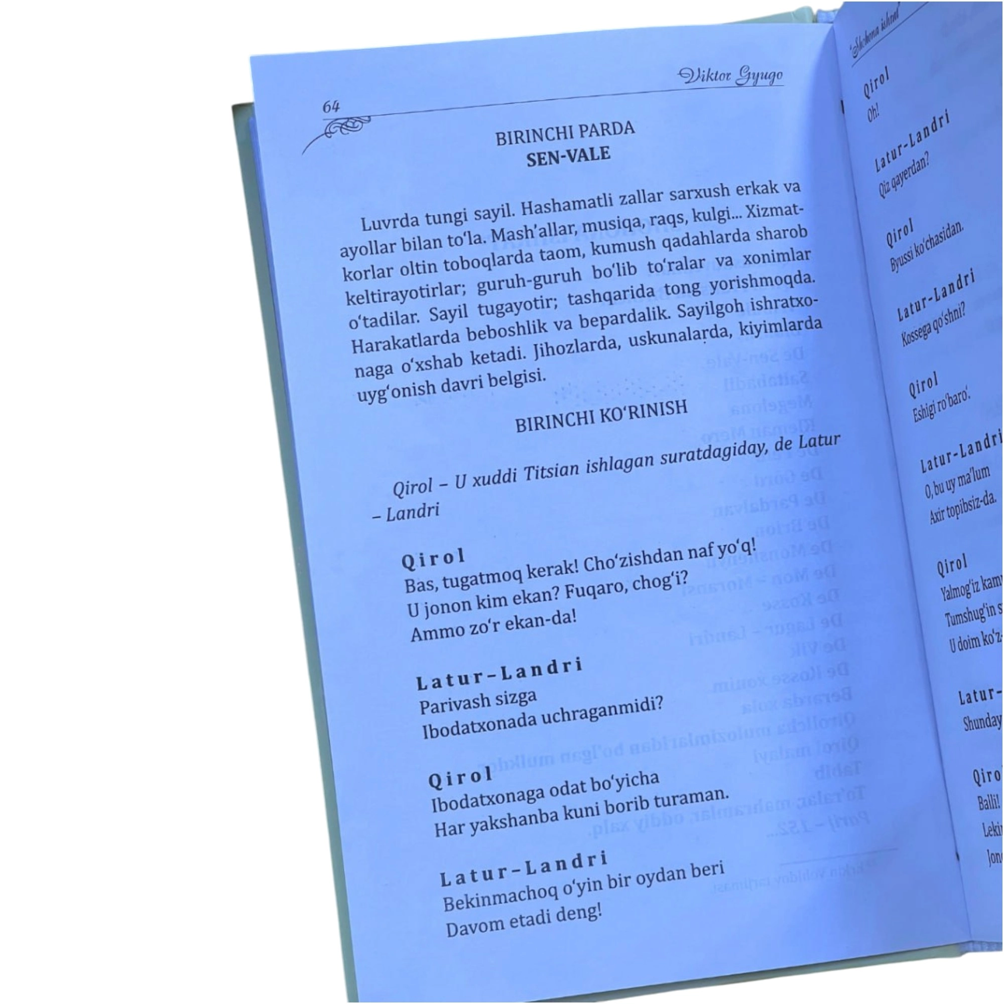 “Shohona ishrat” dramasida esa Gyugo saroy masxarabozi Tribule orqali jamiyatning yashirin illatlarini fosh qiladi.