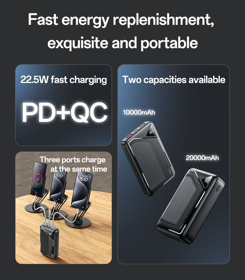 YESIDO YP82 10000mAh Power Bank — портативный аккумулятор с цифровым дисплеем и быстрой зарядкой 22.5W