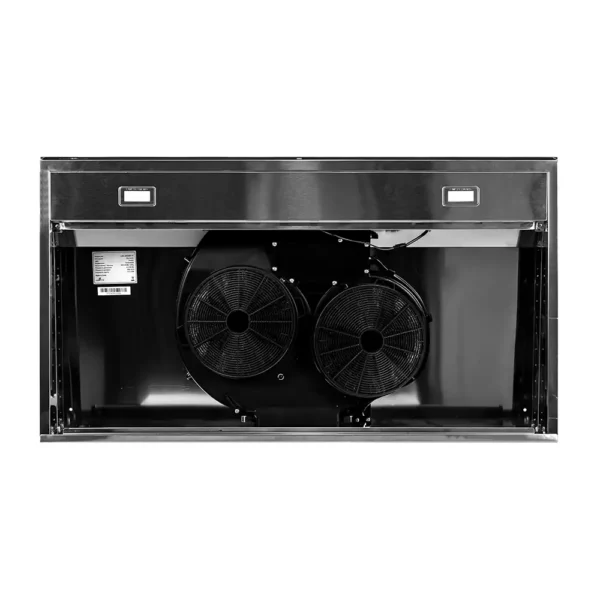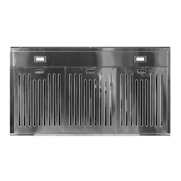 Характеристика: Материал корпуса — Нержавеющая сталь (S.S 430), Освещение — 2 × 1,5 Вт, LED, Управление — Сенсорное + управление жестами, Количество моторов — 2 × 100 Вт, Материал корпуса мотора — Пластиковый, Фильтры — 3 × 2-слойный Baffle + угольный фильтр, Дымоход — Отсутствует, Гибкая труба — 1.0 м, алюминиевая.