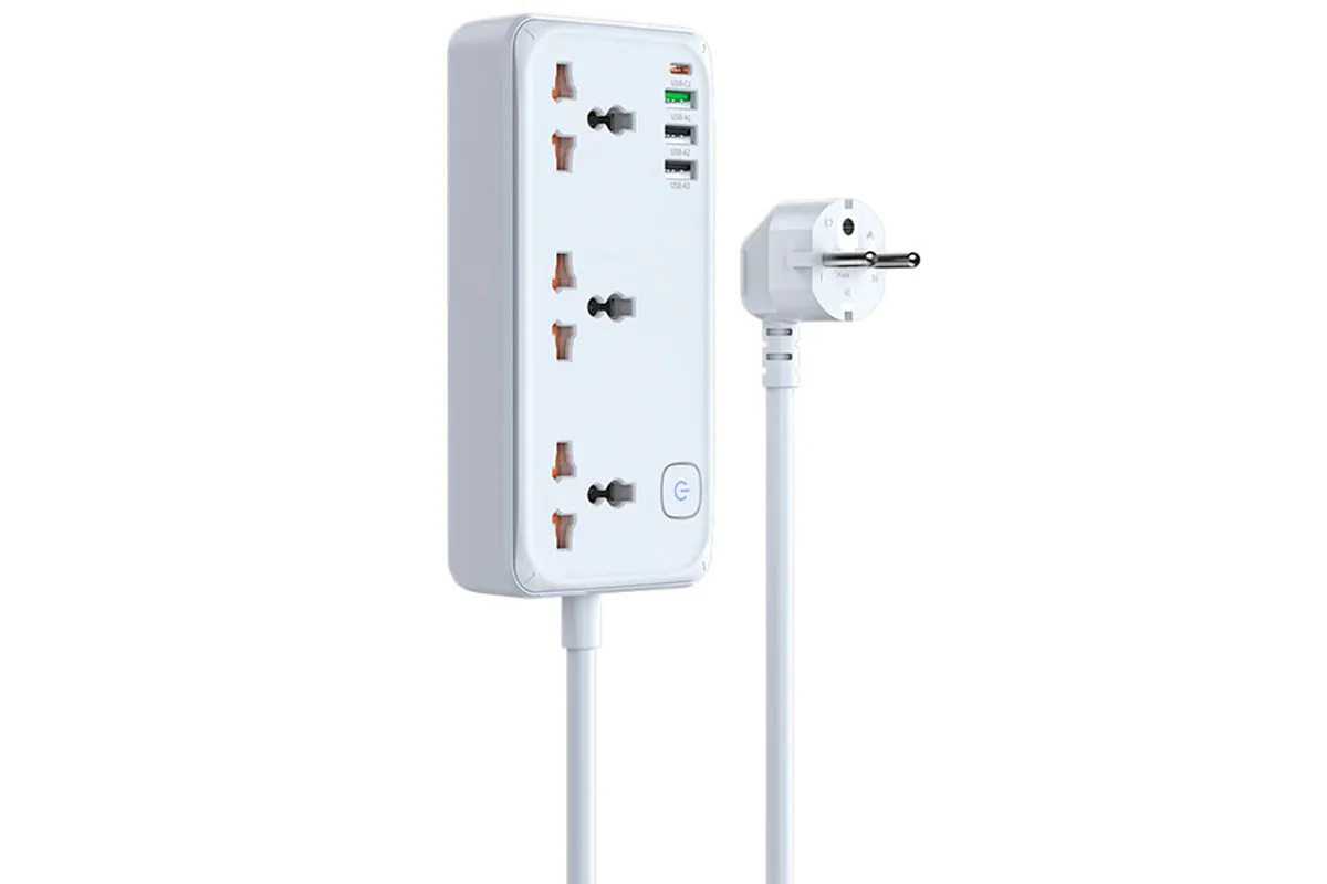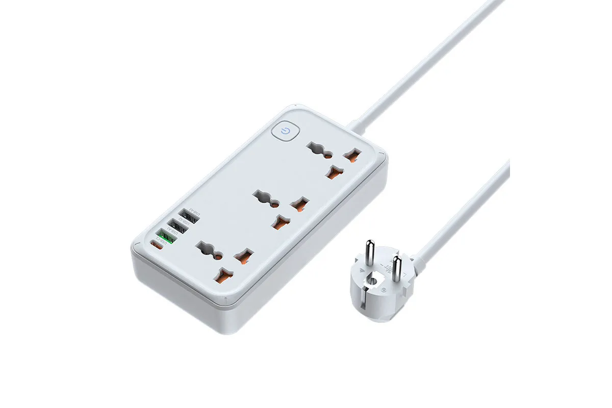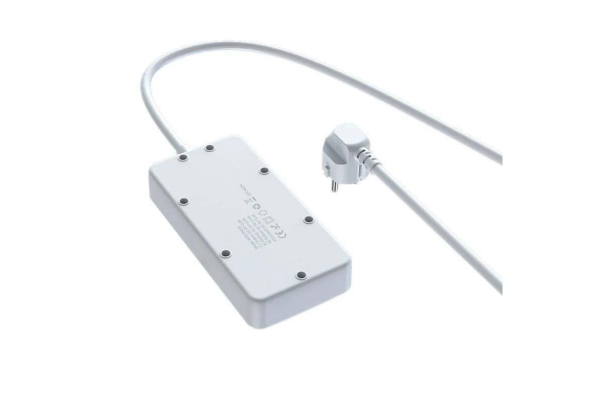 Удлинитель оснащён кабелем длиной 1,5 метра, что позволяет удобно размещать его в любом пространстве — на рабочем столе, возле розетки или в зоне отдыха.