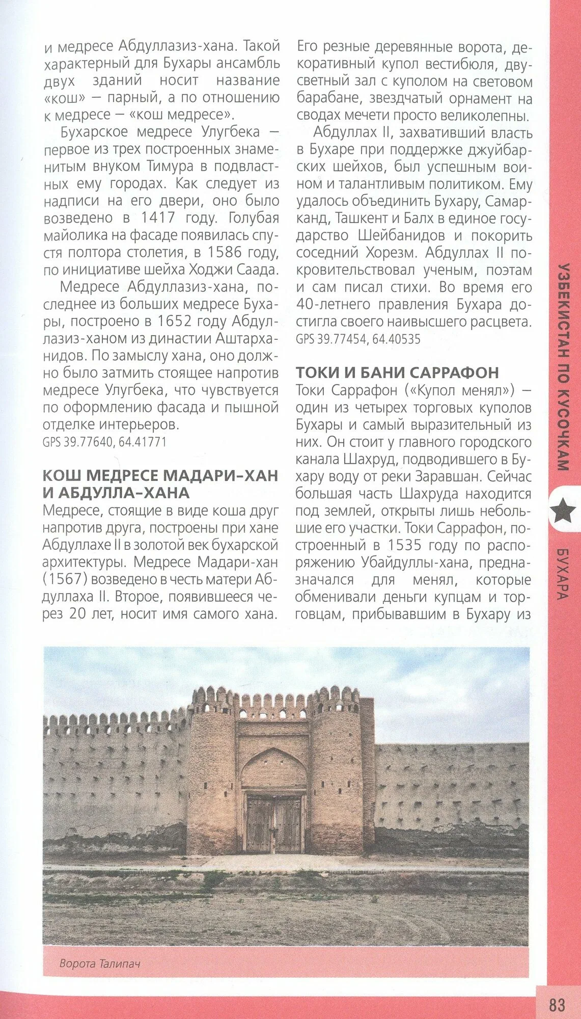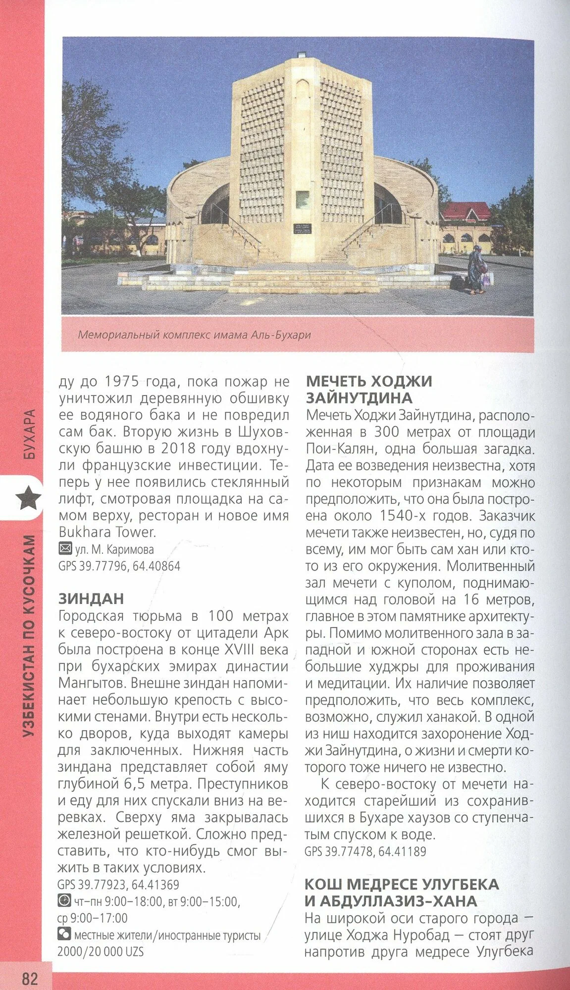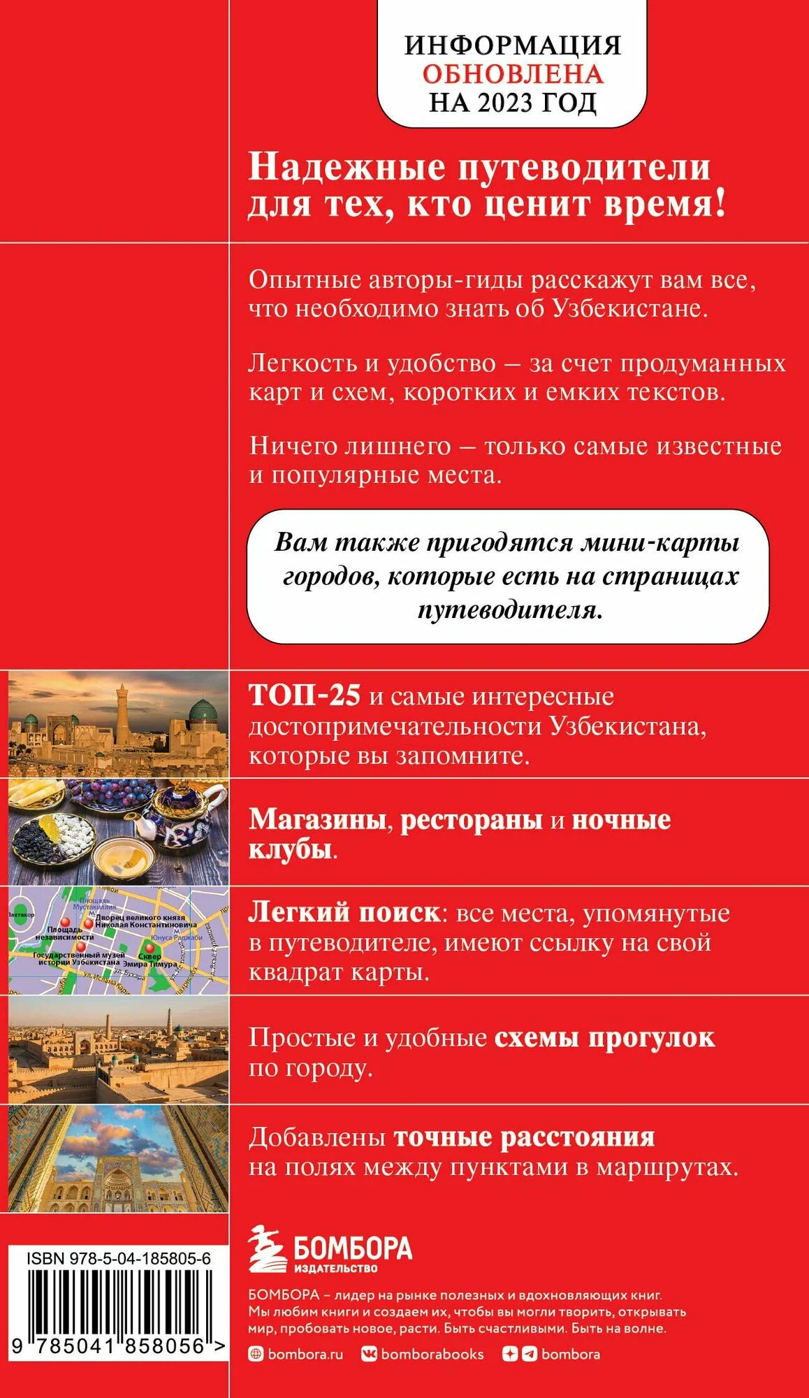 Перед вами гид по Узбекистану - одному из самых популярных направлений этого года . В нем содержится актуальная и полезная информация о стране, советы, как лучше провести первый и второй дни, куда сходить, а также Топ-25 главных достопримечательностей . В путеводителе вы найдете описания самых интересных мест в Ташкенте, Самарканде, Шахрисабзе, Бухаре, Хиве и окрестностях, а сориентироваться на местности помогут готовые маршруты и карты, расположенные на страницах гида . Вся необходимая информация о том, где остановиться и попробовать национальную кухню, куда пойти и как провести время, доступна с серией путеводителей "Красный гид", которые удобно брать с собой в поездку .