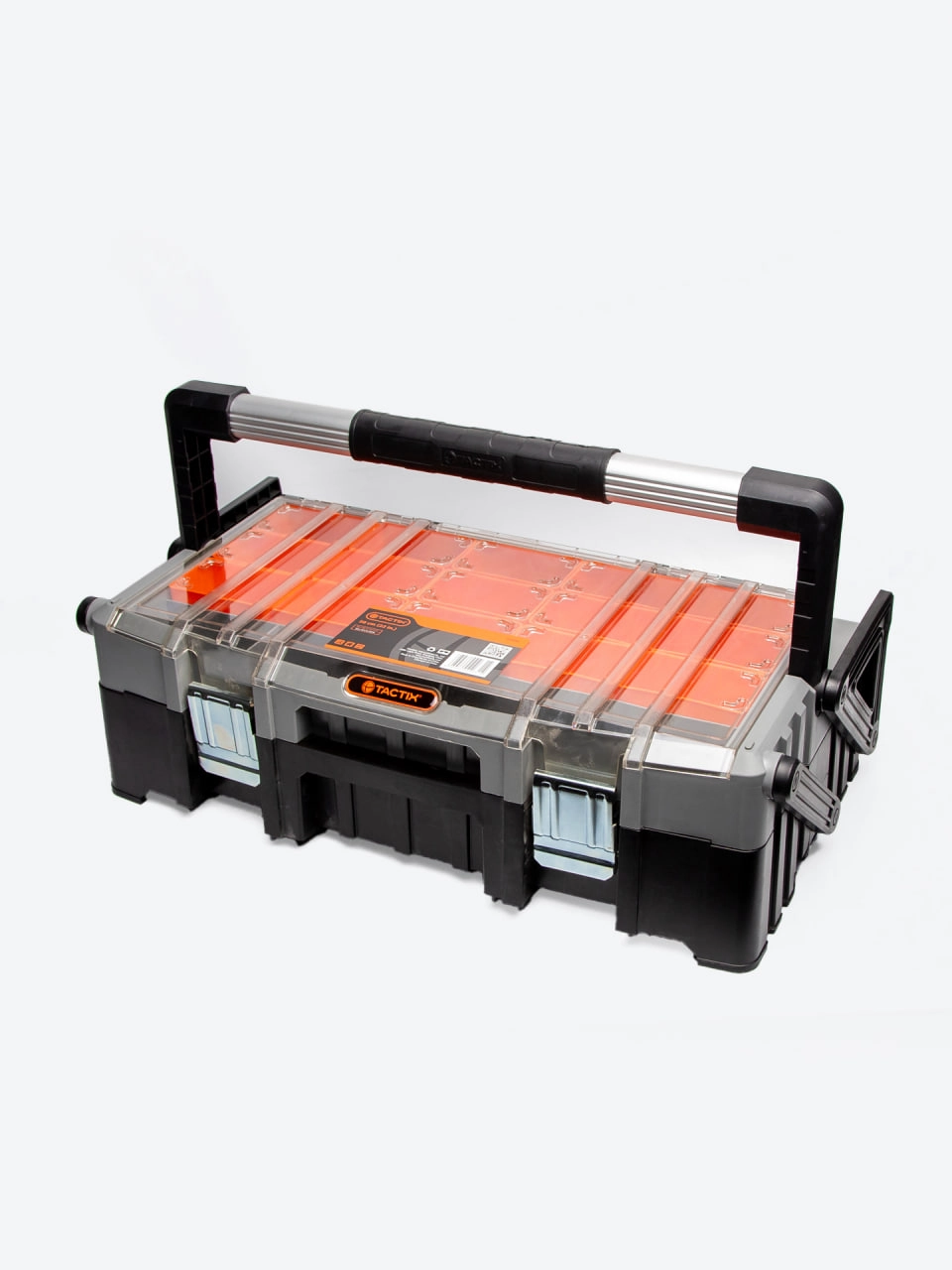 TACTIX 320300 — bu asboblaringizni tartibli saqlash va xavfsiz tashish uchun mo‘ljallangan ishonchli yashik. Ustalar ham, uy sharoitida ta’mirlash ishlarini qiladiganlar ham undan bemalol foydalanishi mumkin.