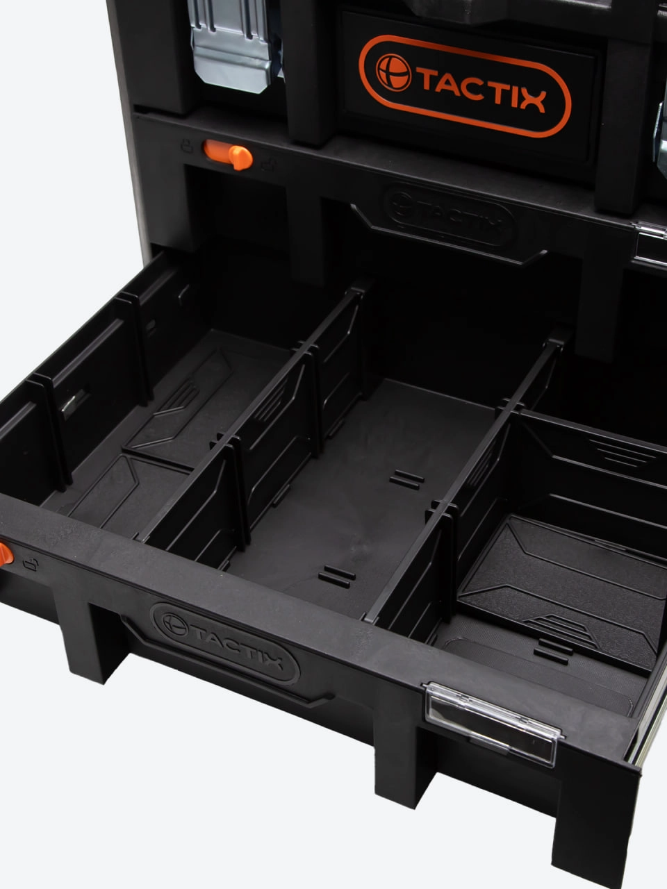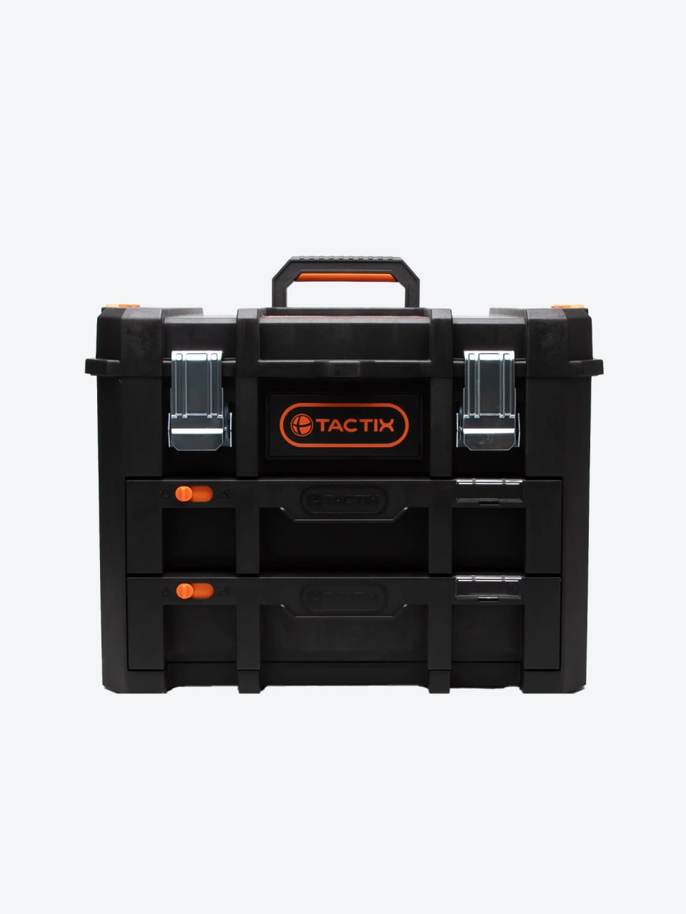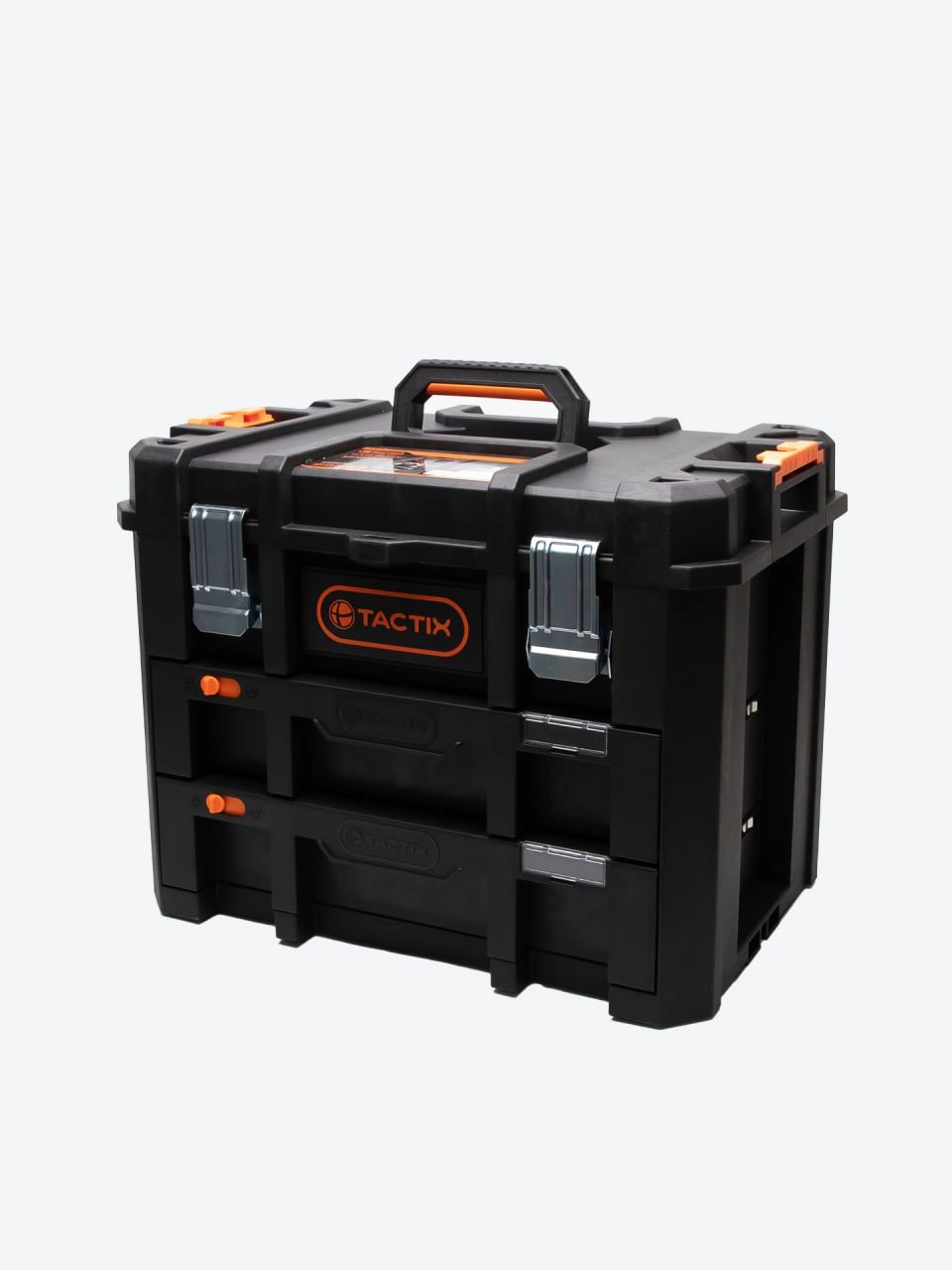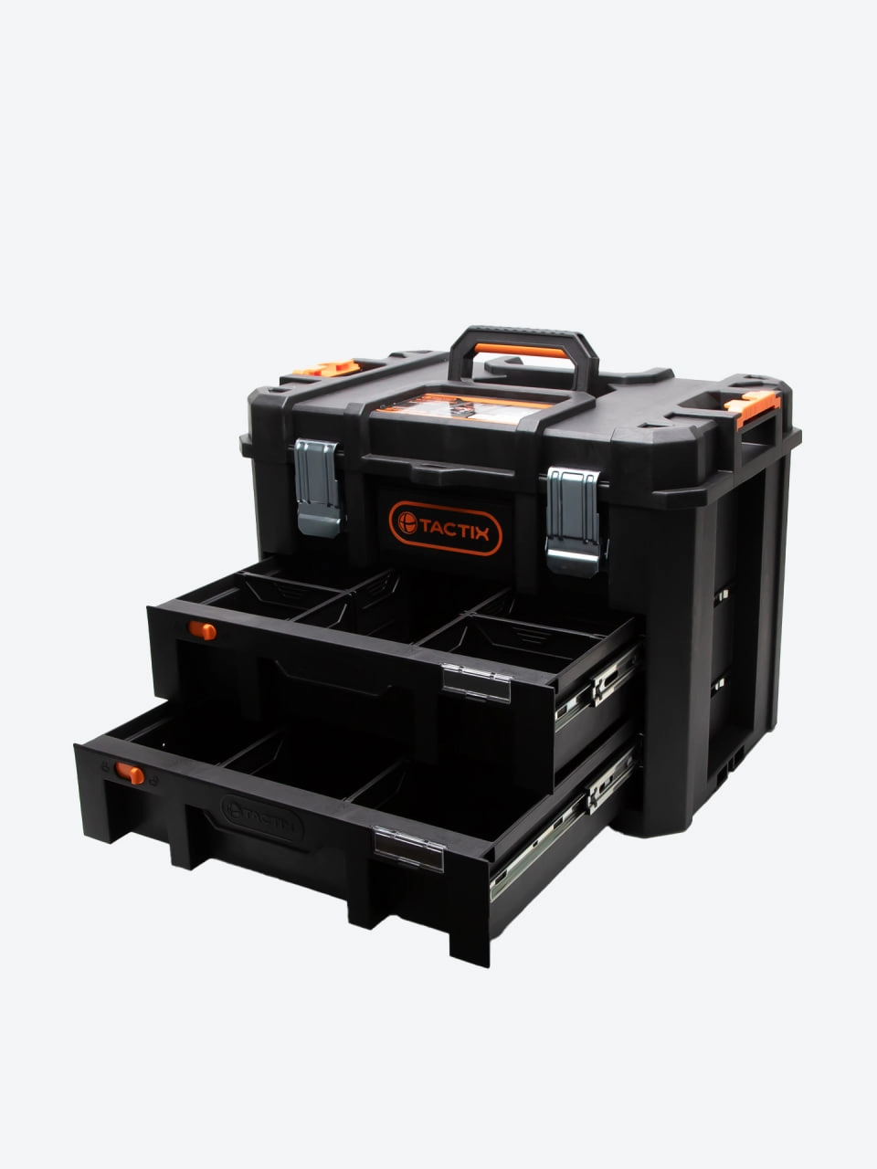 TACTIX 320362 — bu ikki taqsimli tortmalarga ega va yuqori bo‘linmali professional asboblar yashigi. Uning 50 × 40 × 40 sm o‘lchami ixcham bo‘lsa-da, katta sig‘imni ta’minlaydi.