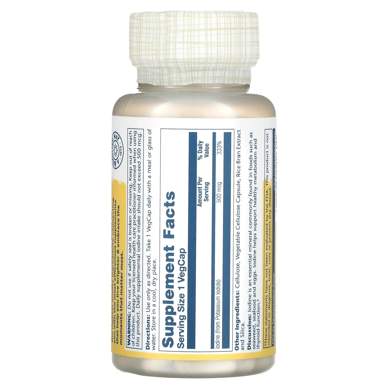 Solaray Iodine 500 мкг — это источник йода в форме йодида калия, жизненно важного микроэлемента для правильной работы щитовидной железы, обмена веществ и выработки гормонов.