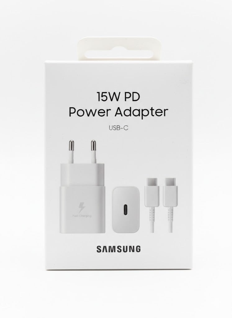 Оригинальное сетевое зарядное устройство Samsung с поддержкой быстрой зарядки Power Delivery мощностью до 15 Вт. Предназначено для безопасной и эффективной зарядки смартфонов, планшетов и других устройств с разъёмом USB-C.