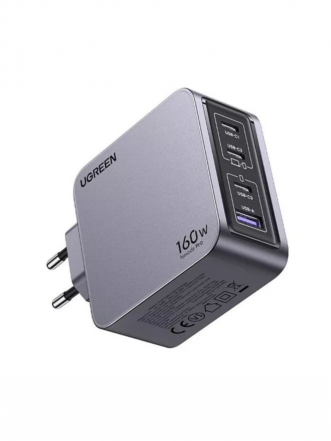 Сетевое зарядное устройство Ugreen X763 USB A + 3 USB C Nexode Pro 160W GaN Tech Fast Charger с кабелем Type-C 240 W 1.5м- новое поколение мощных зарядных устройств собранных на полупроводниках на основе нитрида галлия GaN (Gallium Nitride). Использование кристаллов из новых материалов дало возможность уменьшить вес и размеры зарядного устройства на 30% без потери его производительности.