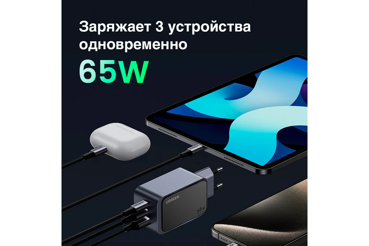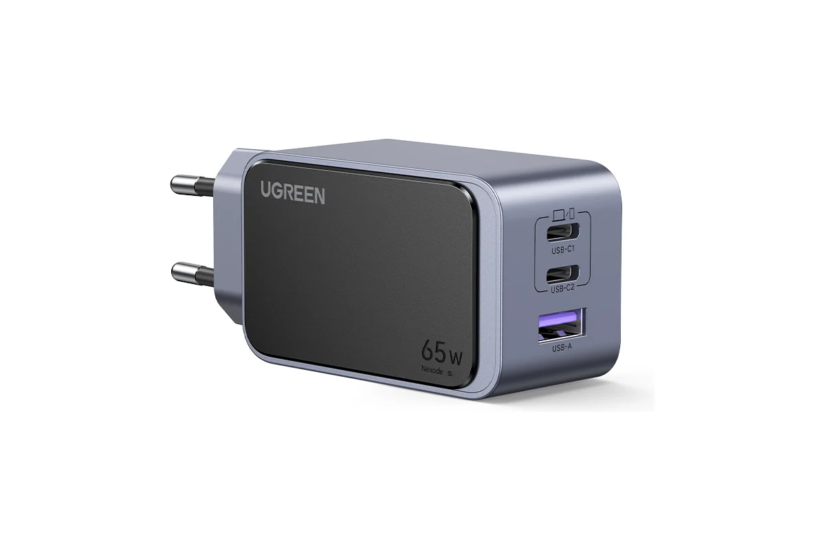 Если вам важна быстрая и эффективная зарядка устройств, то UGREEN Nexode Air станет отличным выбором! Это зарядное устройство обеспечивает мощность до 65 Вт и использует передовую технологию GaN. Она не только ускоряет зарядку, но и делает её более стабильной и безопасной. Зарядка совместима с устройствами популярных брендов, а благодаря трём портам (2x USB-C и 1x USB-A) можно заряжать одновременно несколько гаджетов.