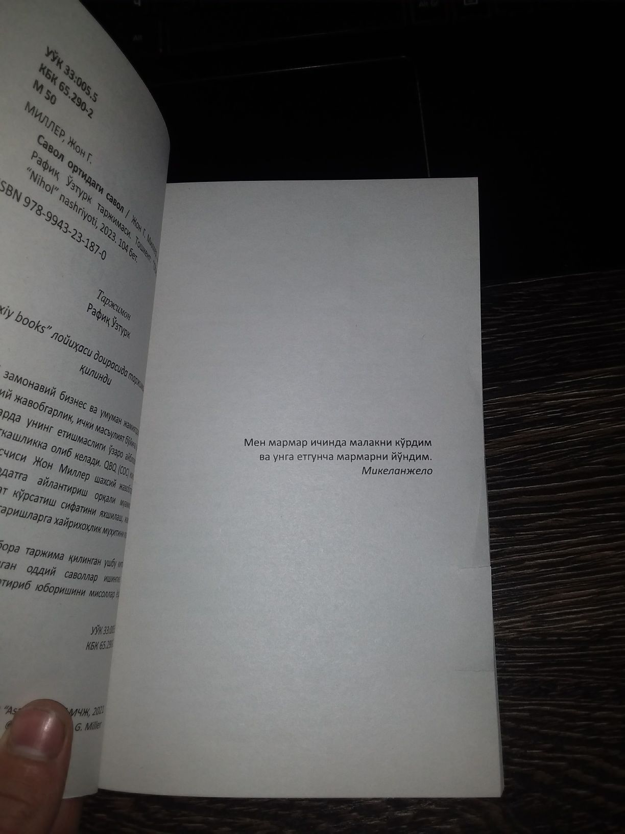 Хуллас, юқорида санаб ўтилганга ўхшаш саволлар- ни эшитган бўлсангиз, бошқалардаги масъулиятсизлик ҳафсалангизни пир қилган бўлса ёки ўзингизда шундай фикрлаш тарзининг айрим жиҳатларини пайқаган бўлсангиз, бу китоб сиз учун! Мутолаадан завқланинг!