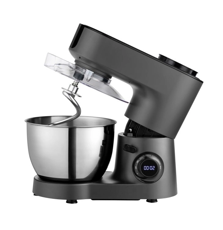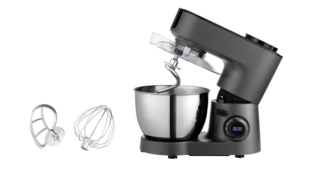 В комплект входят основные насадки из нержавеющей стали: венчик для взбивания, лопатка для замешивания и крюк для смешивания, что делает прибор универсальным помощником на кухне. Дополнительно устройство оснащено цифровым дисплеем, отображающим время работы, что помогает контролировать процесс приготовления.