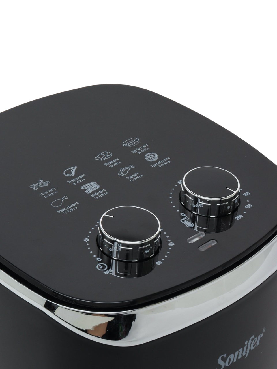 Sonifer SF-1009 zamonaviy dizayn va funksionallikni birlashtiradi. Bosma konstruktsiya taomlarni teng pishirishni ta’minlaydi, sozlanadigan termostat turli taomlar uchun optimal haroratni tanlash imkonini beradi. Oson boshqaruv va katta hajm aerogrilni oshxonada ajralmas yordamchiga aylantiradi, vaqtni tejaydi va yog‘ sarfini kamaytiradi.