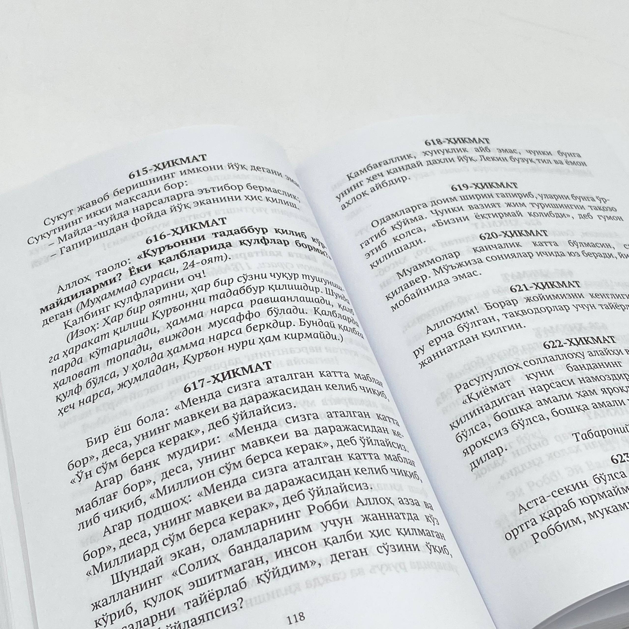 Ushbu kitob hayotning turli sohalarida ko‘ngilni to‘ldiruvchi, sabrga chorlovchi, ruhni quvvatlantiruvchi chuqur hikmatlar majmuasidir. Kitobdagi har bir hikmat sizning dardingizga malham, savolingizga javob, maqsadingizga yo‘l-yo‘riq bo‘lishi mumkin.