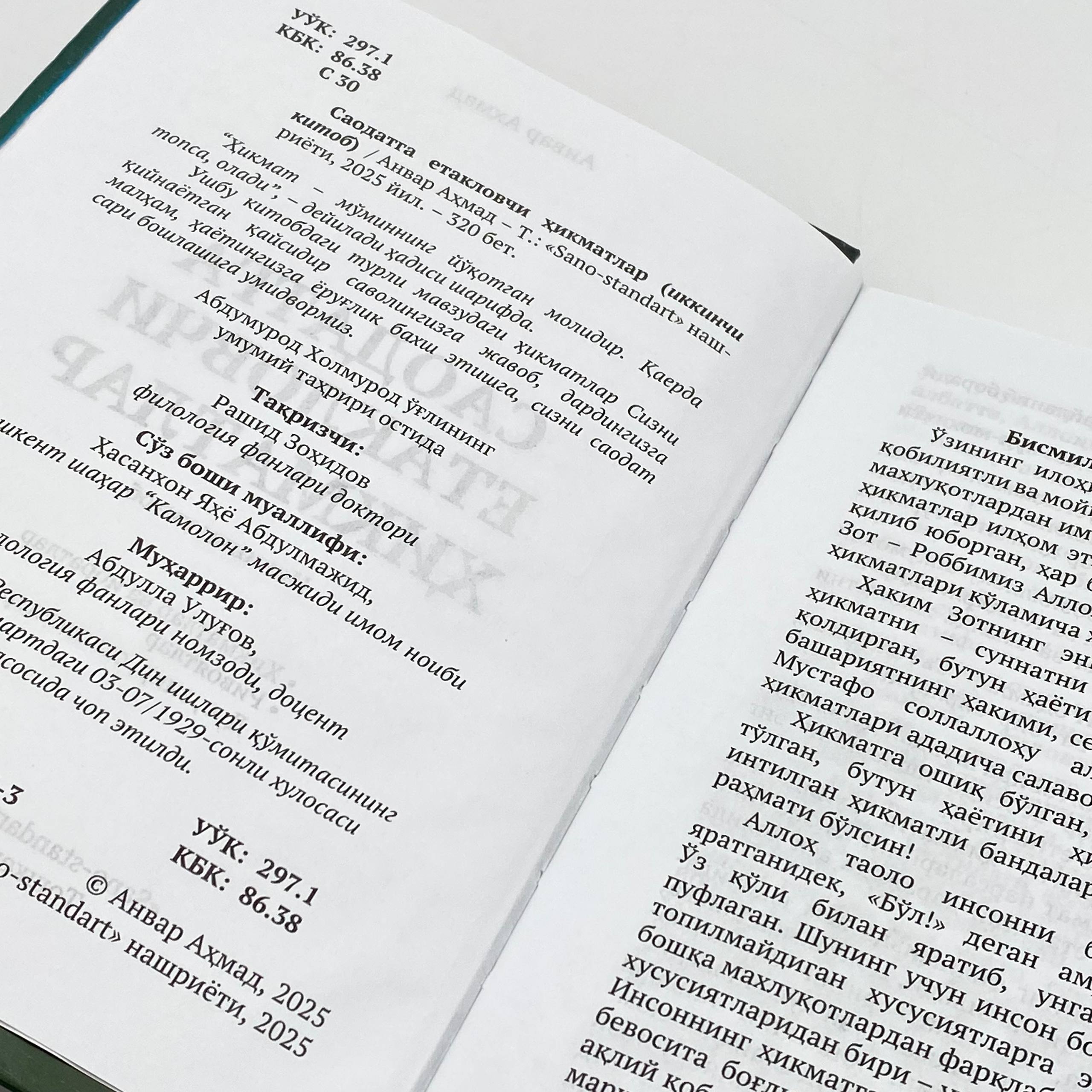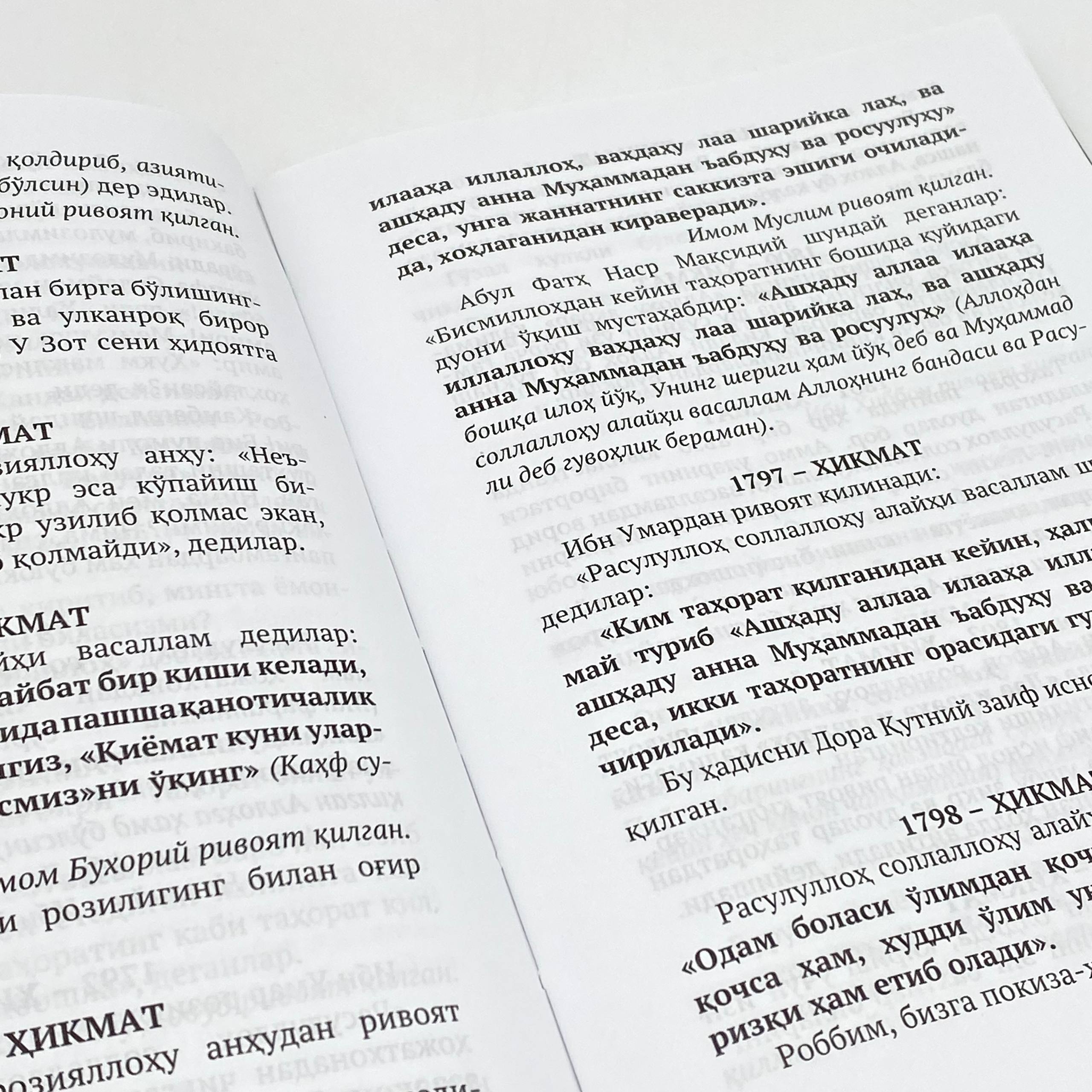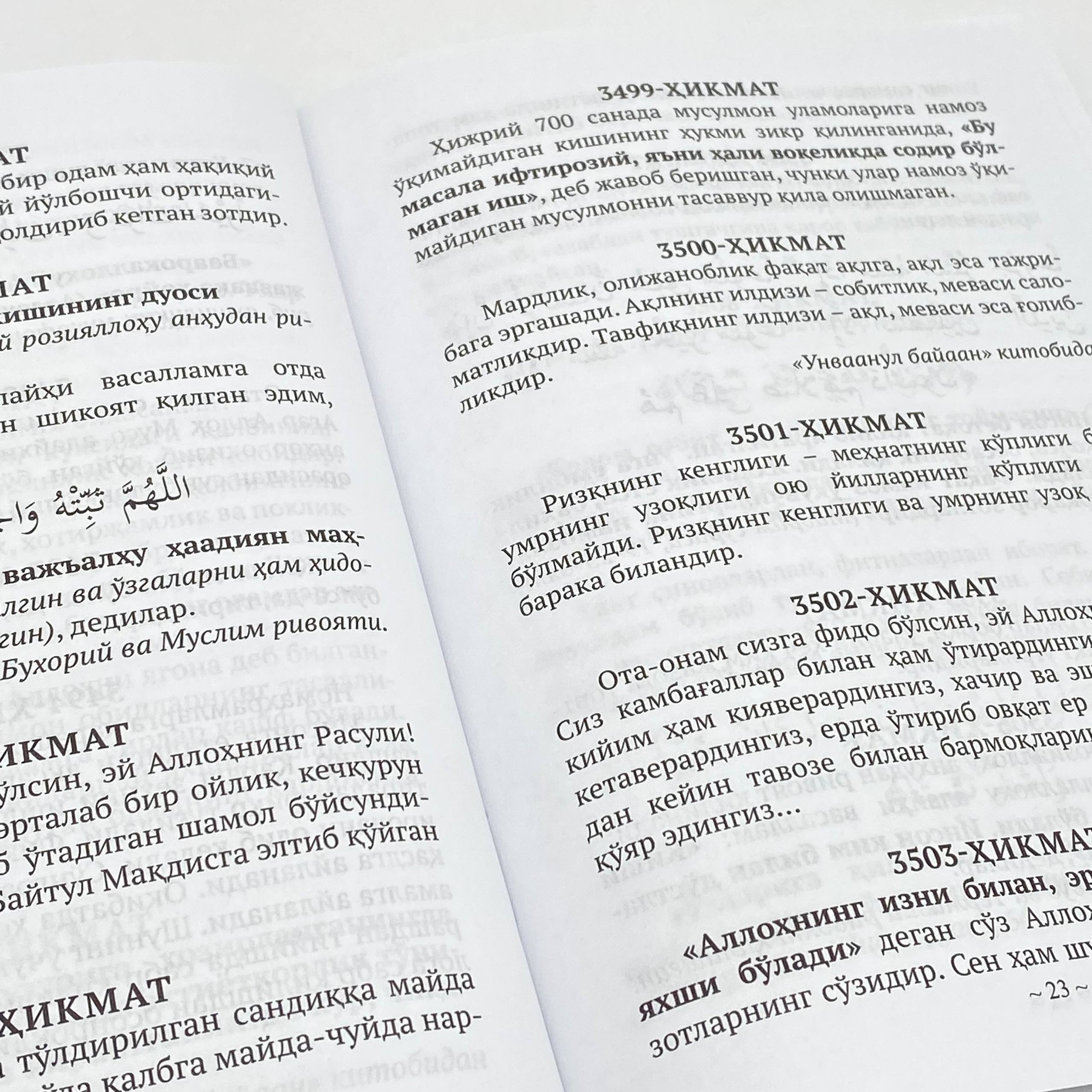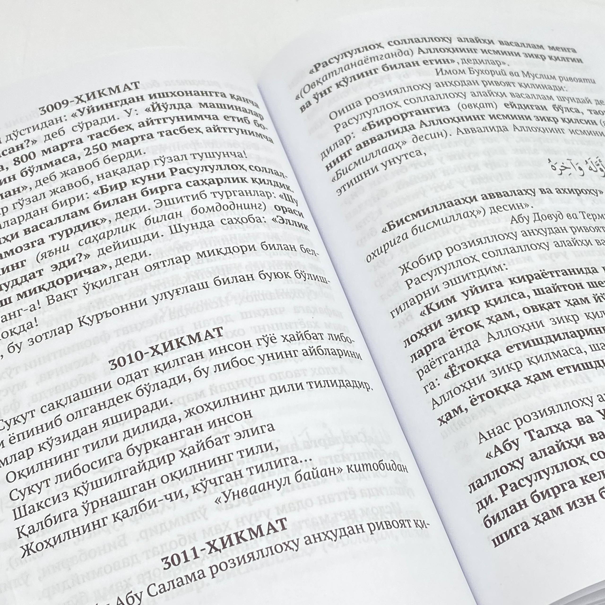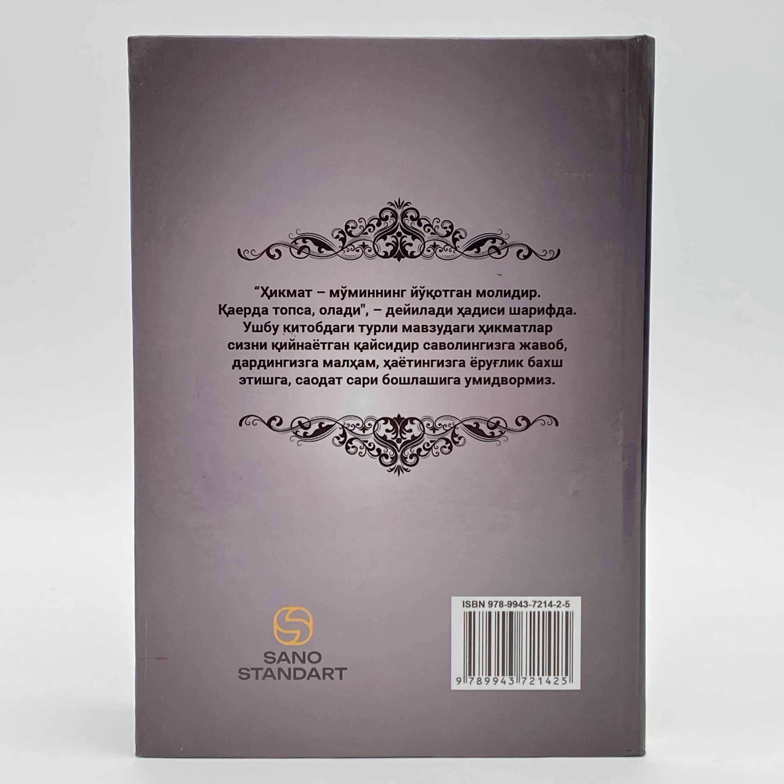 Ushbu kitob hayotning turli sohalarida ko‘ngilni to‘ldiruvchi, sabrga chorlovchi, ruhni quvvatlantiruvchi chuqur hikmatlar majmuasidir. Kitobdagi har bir hikmat sizning dardingizga malham, savolingizga javob, maqsadingizga yo‘l-yo‘riq bo‘lishi mumkin.