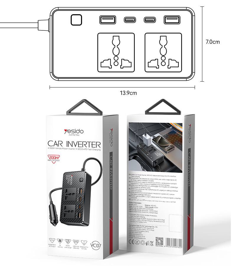 Yesido VC07 Avtomobil Inverteri — bu ixcham va qulay qurilma bo‘lib, avtomobilingiz 12V tokini 220V AC tokka aylantiradi. Shu orqali siz yo‘lda noutbuk, telefon, planshet yoki boshqa kichik elektron qurilmalarni quvvatlashingiz mumkin. Qurilma ortiqcha yuk, qizib ketish va qisqa tutashuvdan himoyalangan. Uning ixcham dizayni uni avtomobilda oson o‘rnatish va ishlatishni ta’minlaydi.