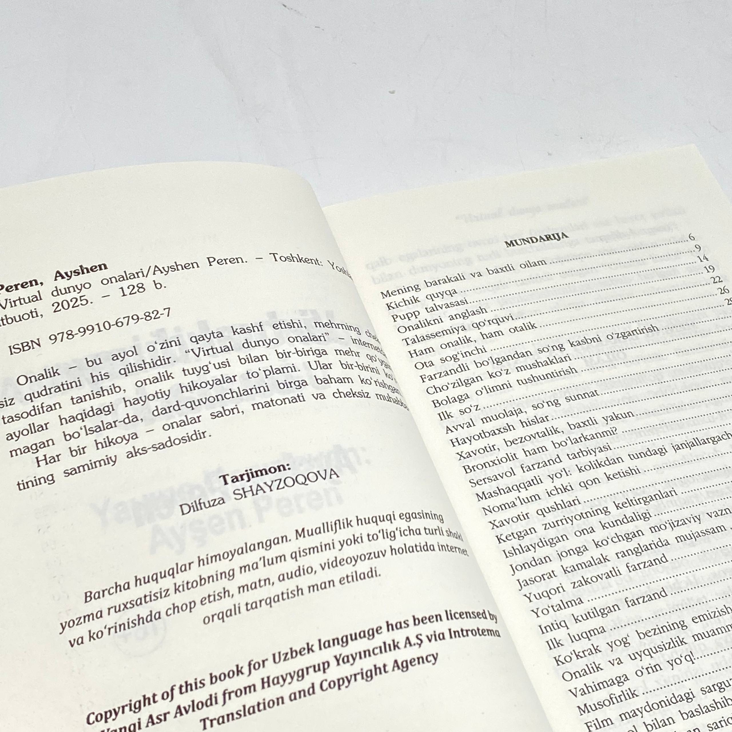 Onalik - bu ayol o'zini qayta kashf etishi, mehrning cheksiz qudratini his qilishidir. "Virtual dunyo onalari" - internetda tasodifan tanishib, onalik tuyg'usi bilan bir-biriga mehr qo'ygan ayollar haqidagi hayotiy hikoyalar to'plami. Ular bir-birini ko'rmagan bo'lsalar-da, dard-quvonchlarini birga baham ko'rishgan.