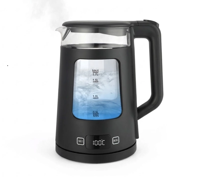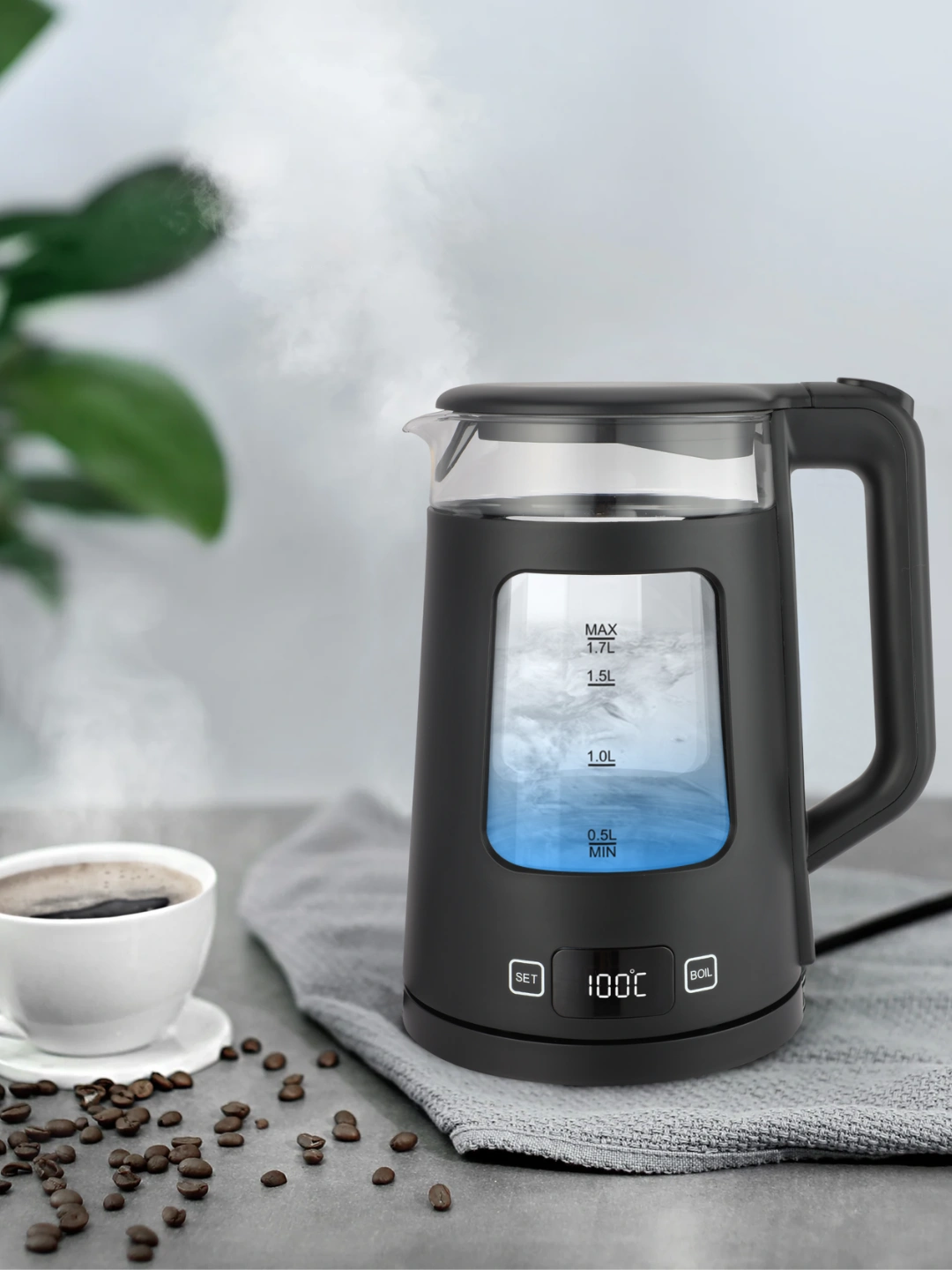 Borosilikat shishadan tayyorlangan korpus qurilmaga yengillik va premium ko‘rinish beradi, shu bilan birga suv qizish jarayonini kuzatish imkonini yaratadi. Zamonaviy LED yoritish jarayonni yanada jozibador qiladi, qora rangli elementlar esa umumiy dizaynni yanada zamonaviy va kontrastli ko‘rsatadi.