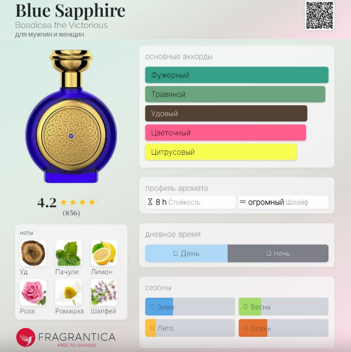 Blue Sapphire – bu Boadicea the Victorious Blue Sapphire kultiy sharqiy-yog'ochli atirining olijanob talqini. Kompozitsiya dabdaba, kuch va sezgirilikni birlashtiradi, originalning taniqli xususiyatini saqlaydi, lekin arzonroq talqinda.